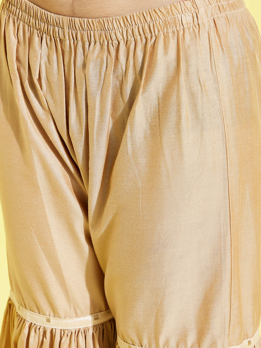 Gold straight knee length kurta, three quater sleeves, has round neck, Woven design, straight hem and side slits. Comes with rose gold sharara, has elasticated waistband.