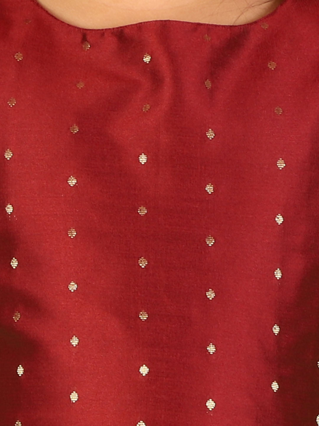 Girls Maroon woven design booti crop top has ruffled short sleeves and round neck It is made with silk blend fabric.