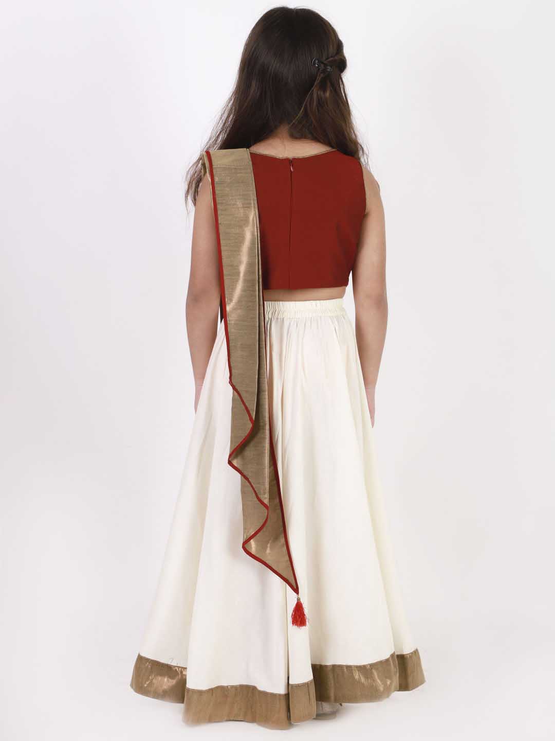 Beautifully handcrafted Crop Top Lehenga Skirt Set for Girls. It is made with Viscose fabric, is sleeveless, round neck, hook and eye closure. The crop top is embellished with zardozi buta. Comes with a full floor length skirt on elasticated waistband and drape dupatta