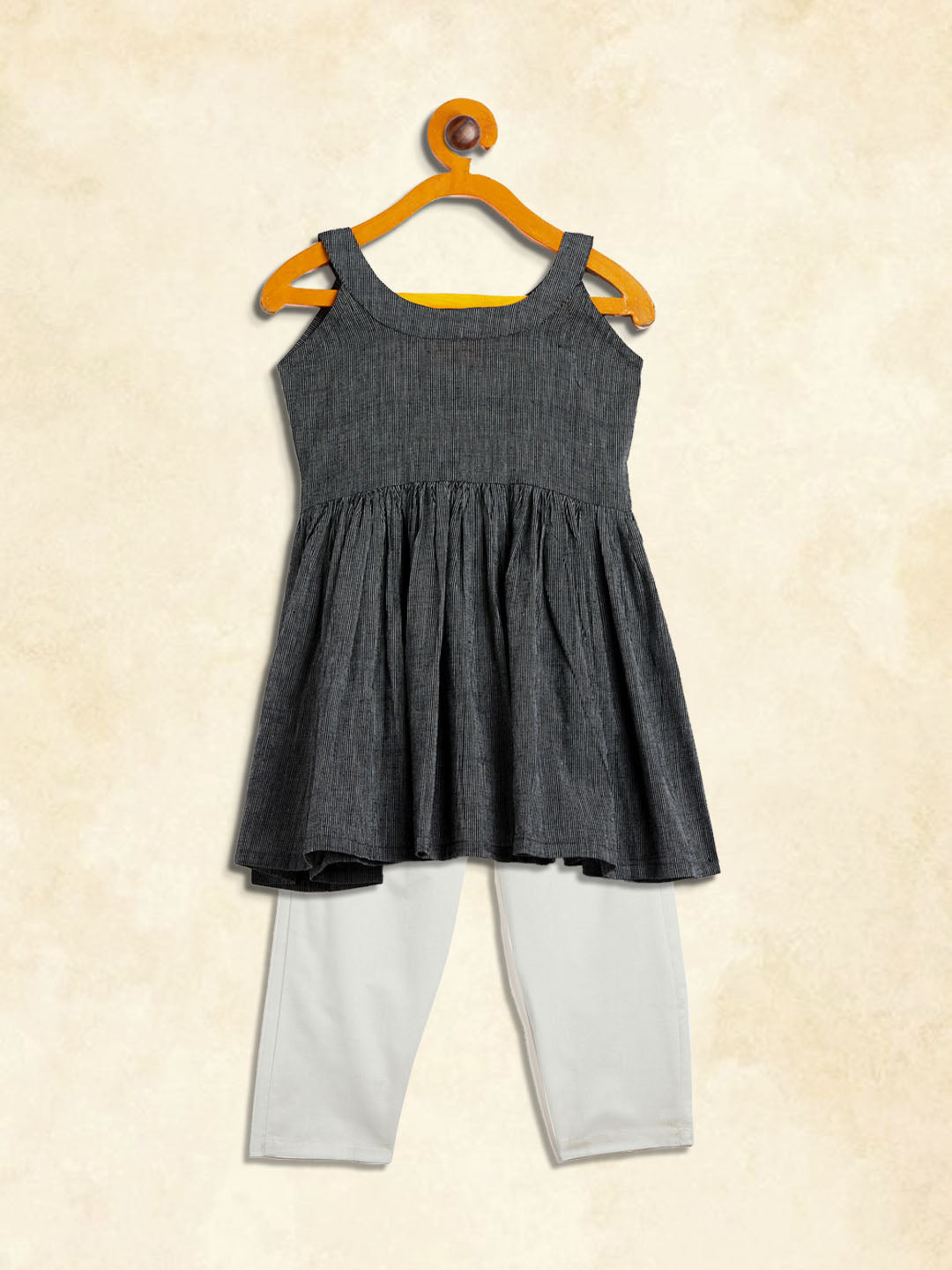 VASTRAMAY SISHU Girl's Black Striped Handloom Kurta With Cream Pyjama Set