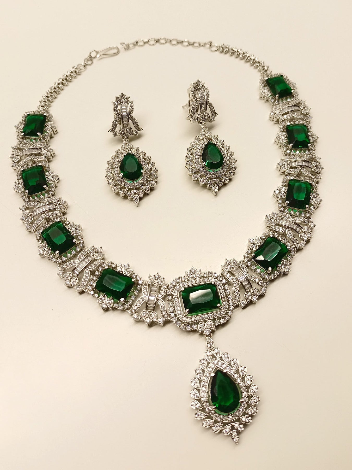 Introducing the Adrienne Green American Diamond Necklace Set, where sophistication meets timeless elegance. This captivating set, crafted with high-quality silver-plated brass, radiates with vibrant green American diamonds, ensuring you make a striking impression wherever you go.