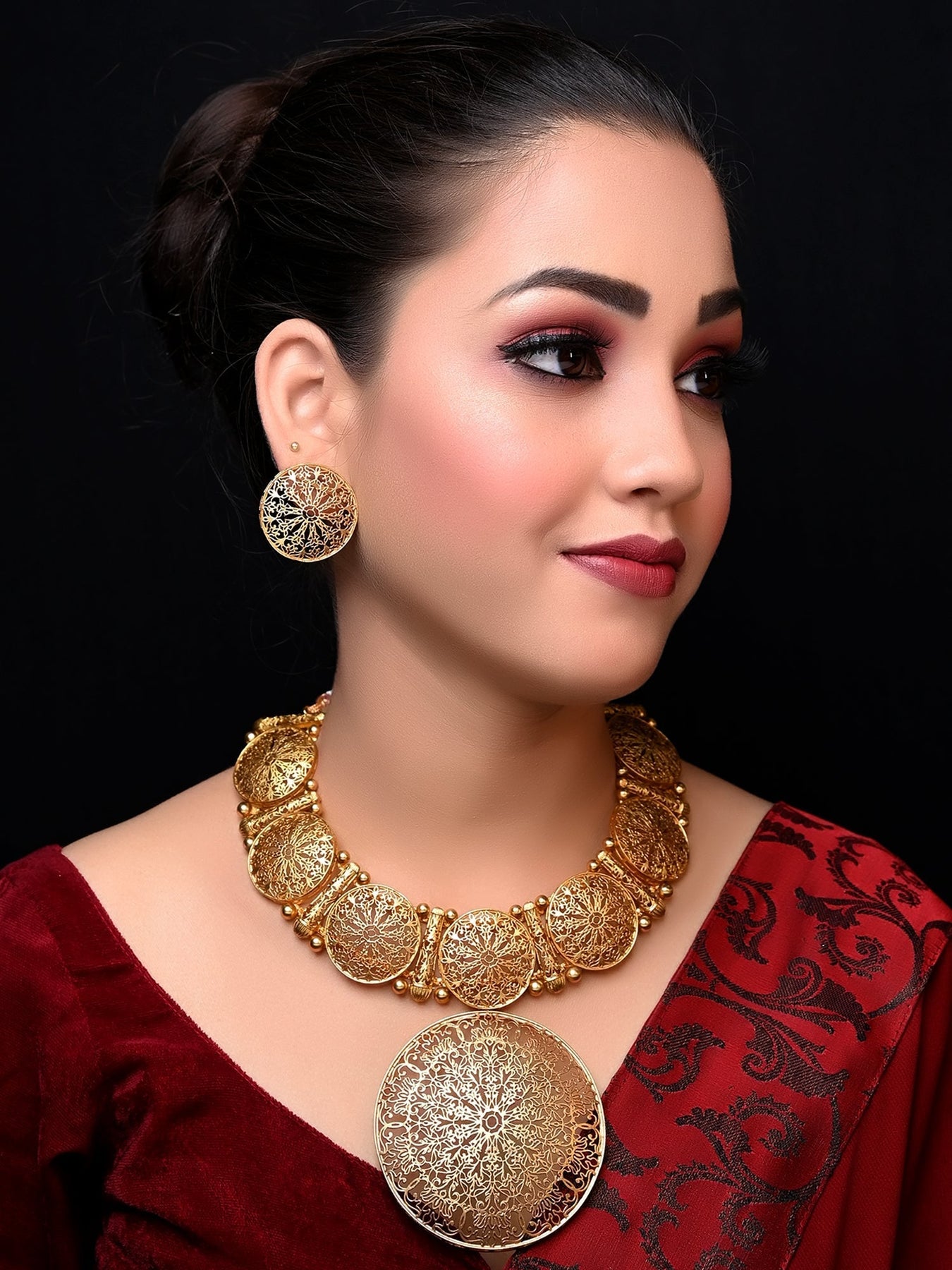 Crafted with precision, this magnificent set is adorned with intricate round tops, skillfully designed on sturdy brass metal and lavishly plated with gold. It's more than just a jewelry set; it's a celebration of heritage and grace.