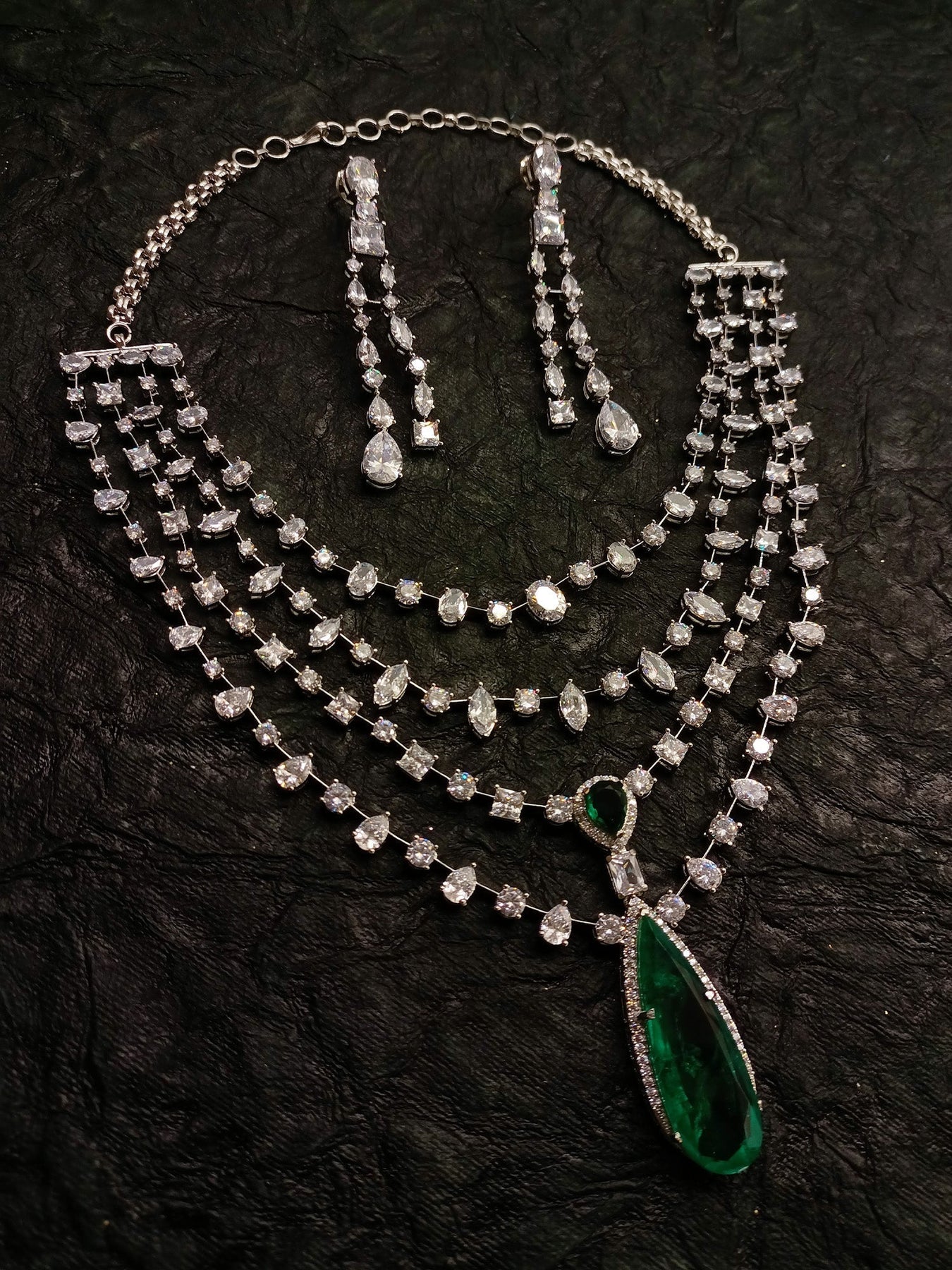 Discover the elegance and sophistication of the Ives Emerald American Diamond Set, a perfect harmony of style and luxury. This exquisite set combines the captivating allure of emerald stones with the brilliance of American diamonds, all accented by a stunning triple-layered silver finish. It's more than just jewelry; it's a statement piece that elevates any ensemble.