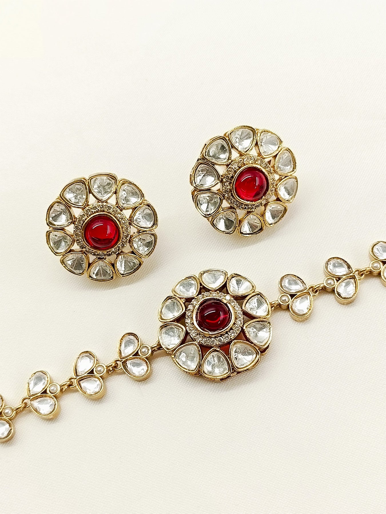 This Maroon Kundan Choker Set Is The Perfect Blend Of Elegance And Modernity. Crafted With Gold Plated Brass Metal, It Features A Beautiful American Diamond Setting And A Green Stone At Its Center. Enhance Your Look With This Stunning And Unique Choker Set.