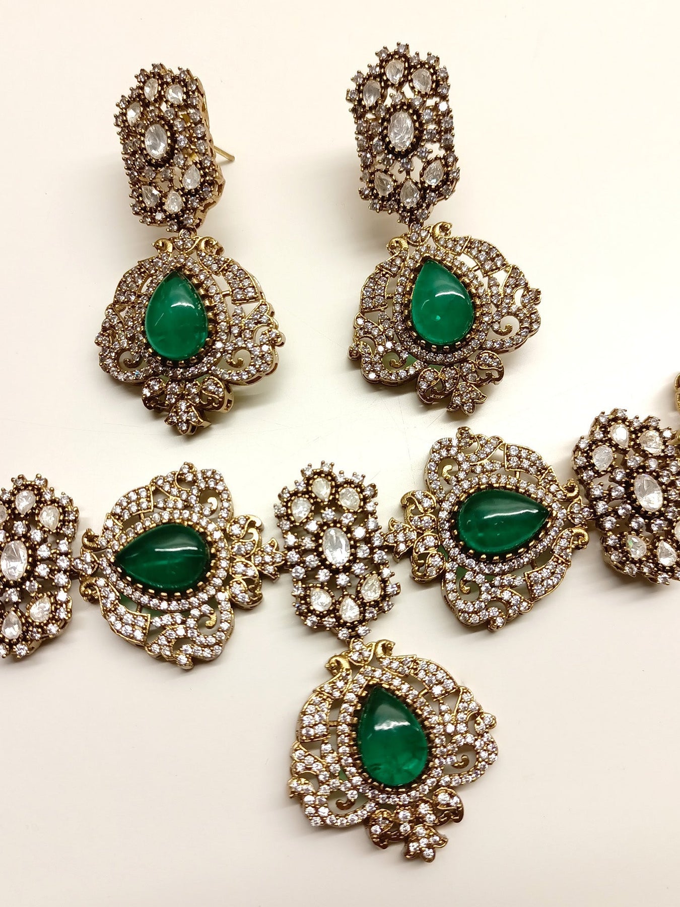 Discover the timeless elegance of the Tapti Green Victorian Necklace Set, an exquisite piece that beautifully combines classic charm with modern sophistication. Crafted from antique gold-plated brass, this stunning set is adorned with a dazzling arrangement of American diamonds, ensuring you shine brilliantly on any special occasion.