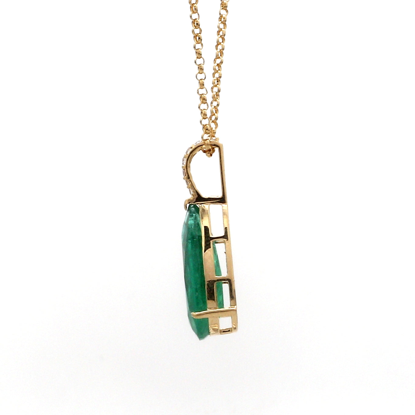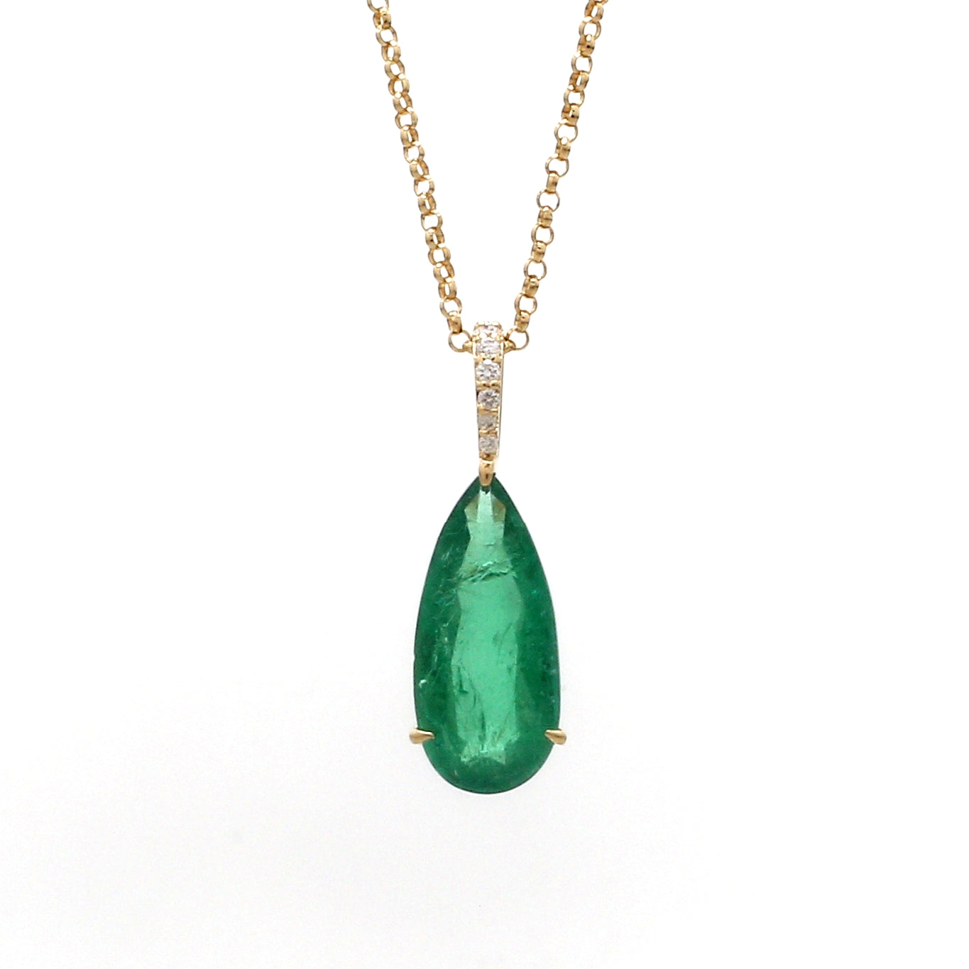 This classic pear emerald necklace has lush green Zambian emerald set in prong setting. The natural white diamonds set on the loop adds perfect sparkle to the necklace. Set in 14K/18K gold this necklace is perfectly stackable and suitable for all occasions.