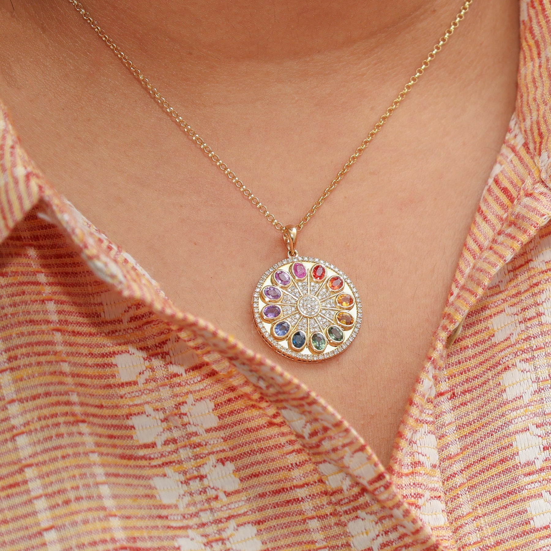 Rainbow Sapphire Oval Diamond Disc Necklace