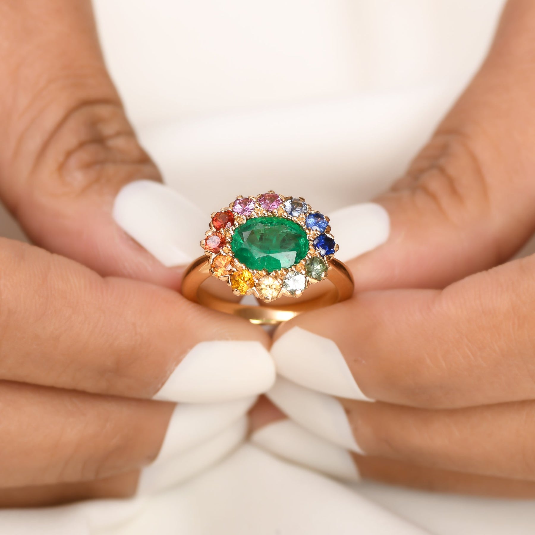 Emerald and Rainbow Gemstone Halo Ring - qivii