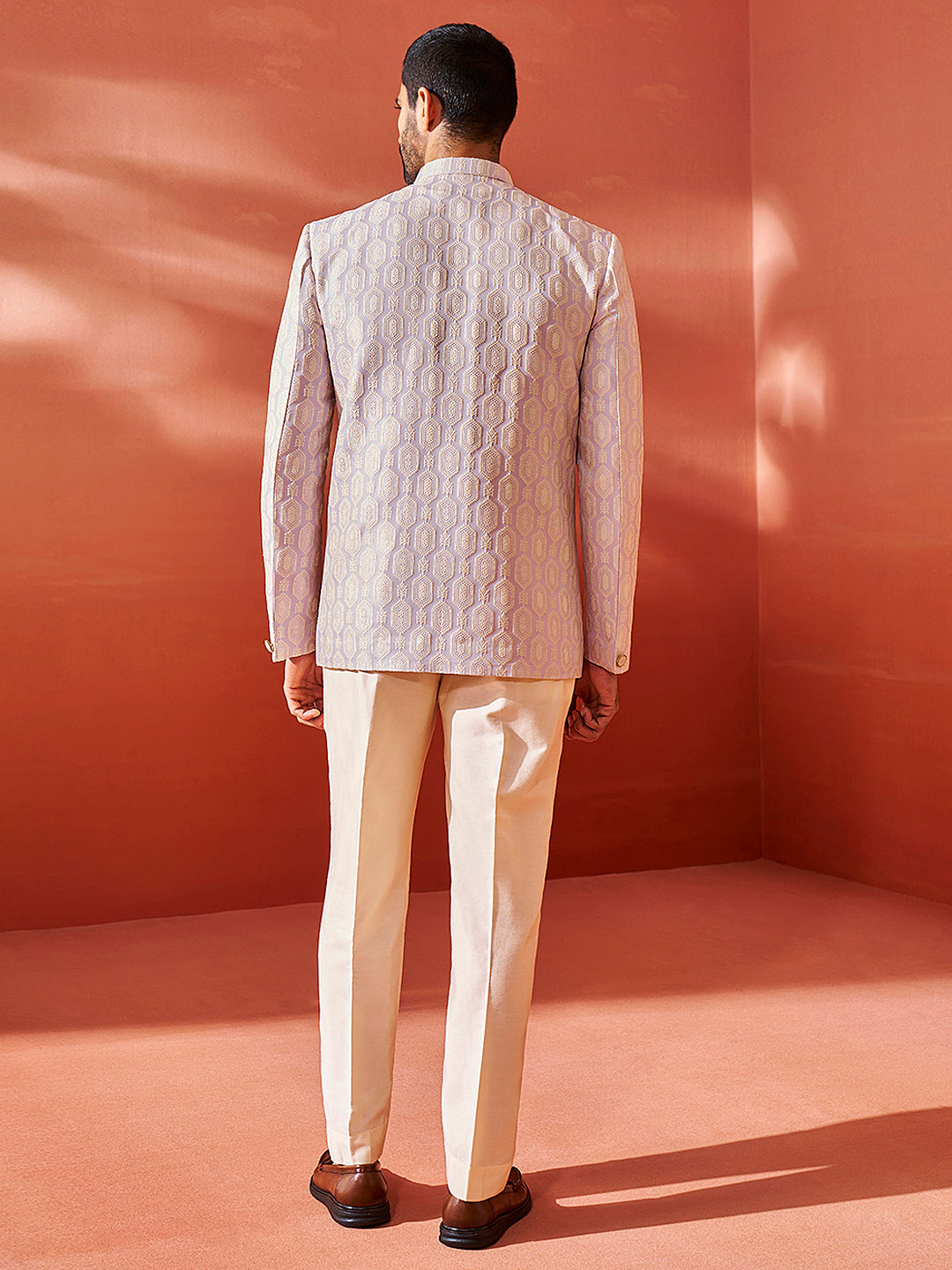 Silk blend Jacquard slim-fit jodhpuri, has a mandarin collar, long sleeves, a full button placket,Straight hem and one welt pocket.Comes with pant style pyjama, has a waistband with partially elasticated, button closure, side pockets.Wear it in parties,traditional functions and festive occasion.