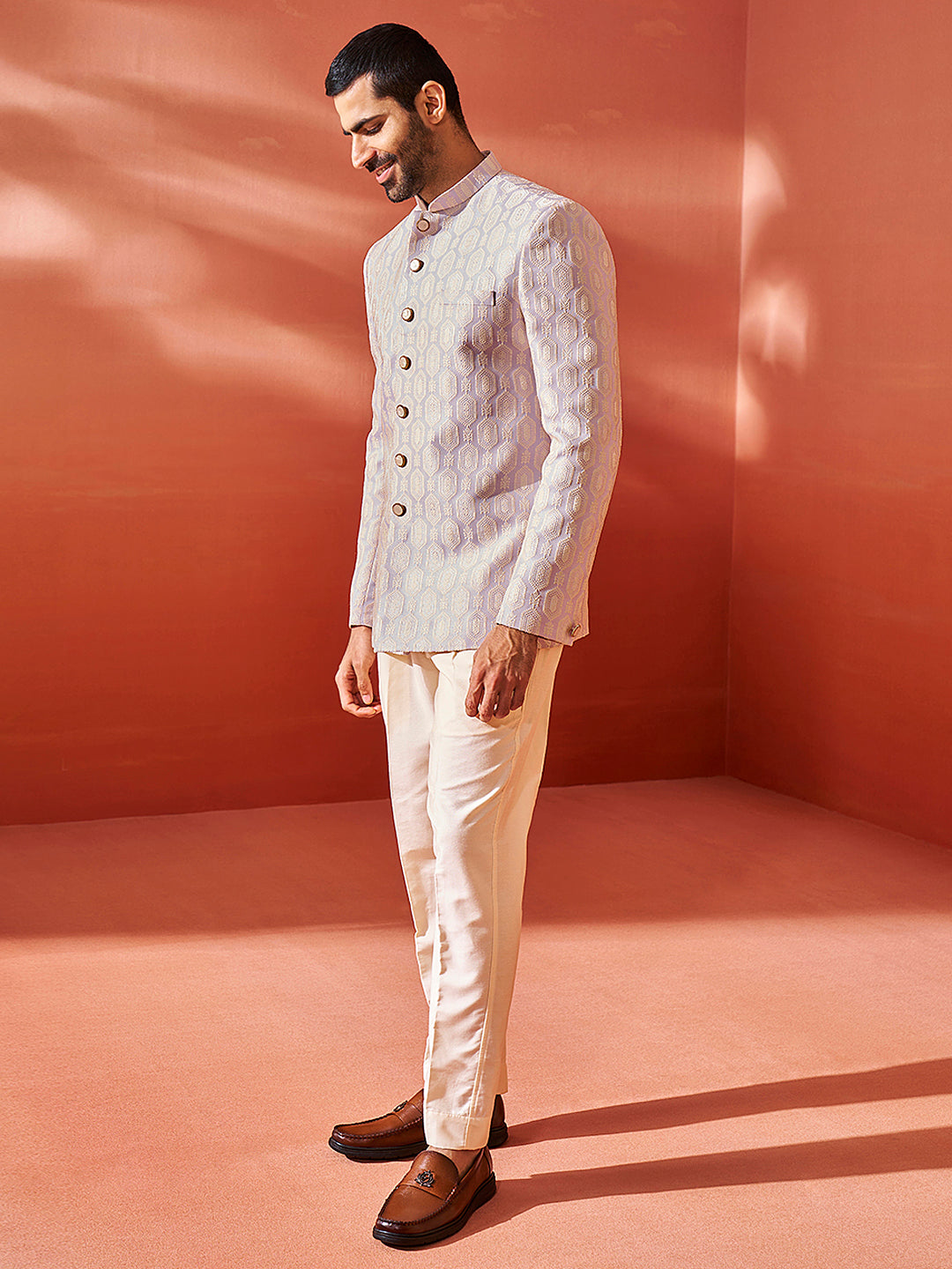 Silk blend Jacquard slim-fit jodhpuri, has a mandarin collar, long sleeves, a full button placket,Straight hem and one welt pocket.Comes with pant style pyjama, has a waistband with partially elasticated, button closure, side pockets.Wear it in parties,traditional functions and festive occasion.