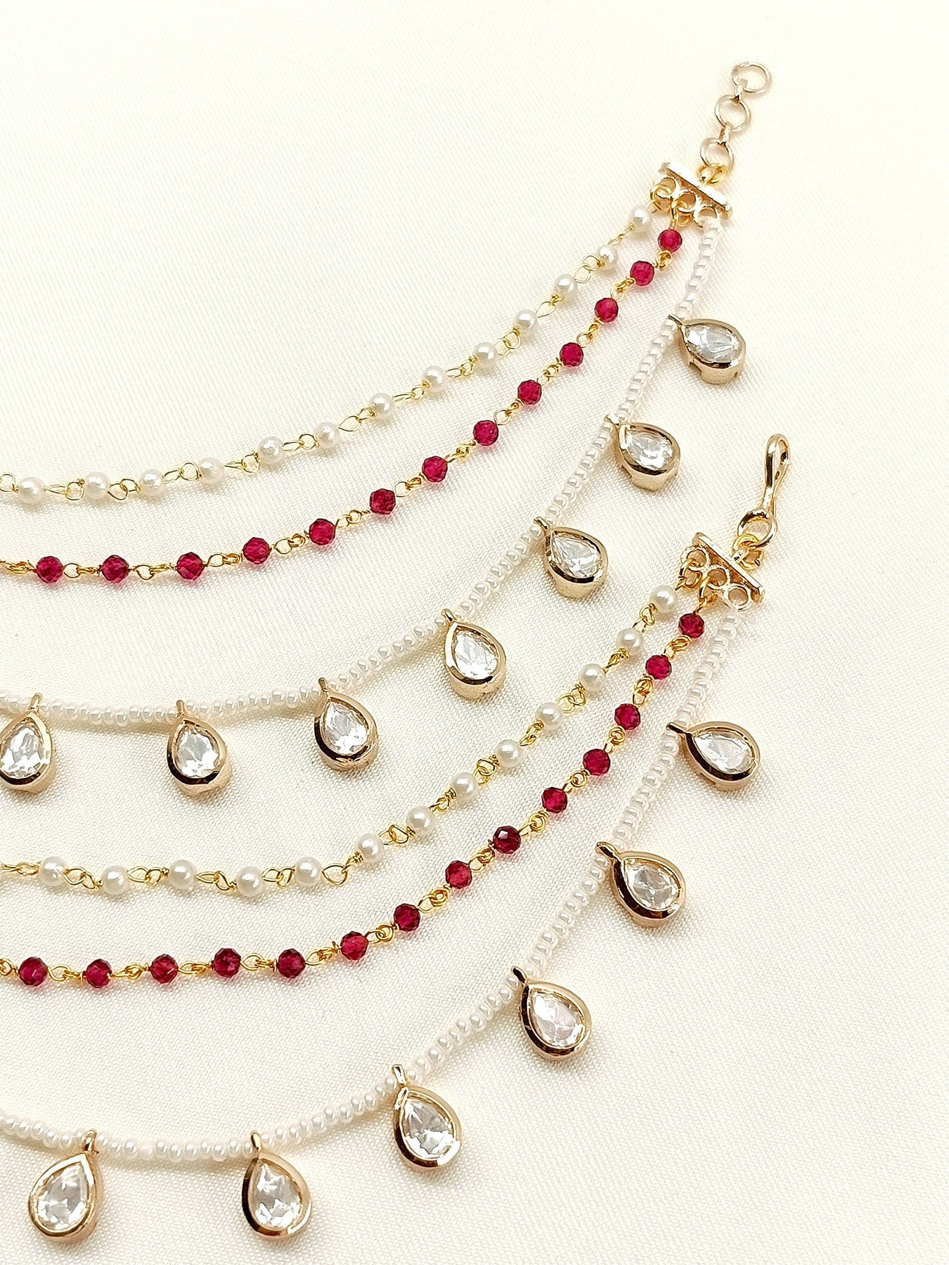 This Majenta Traditional Ear Chain combines traditional design, triple layering, gold plating, and embellishments of kundan, pearl, and semi-precious beads. Enhance your outfit with this elegant and timeless piece.