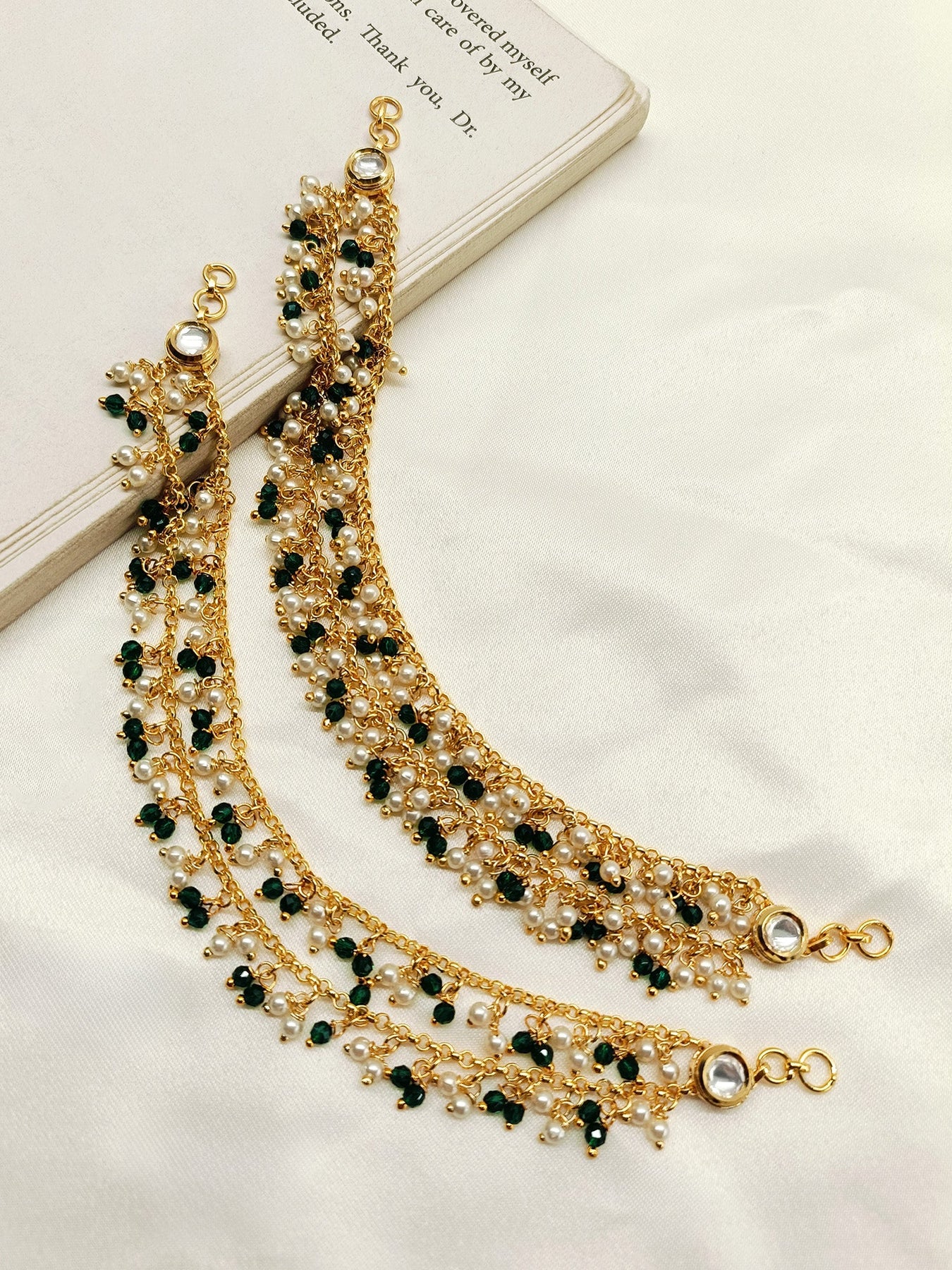 Traditional Beautifully Designed Double Layerd Gold Chain With Pearl And Green Beads Hanging Kaan Chain For Ears To Give Complete Ethnic Look - Gold Plated Brass Metal With Pearls And Stones