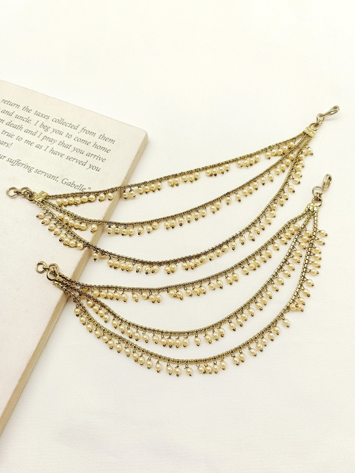 Traditional Beautifully Designed Antique Gold Plated Brass Metal Triple Layerd Kaan Chain With Hanging For Ears To Give Complete Ethnic Look.