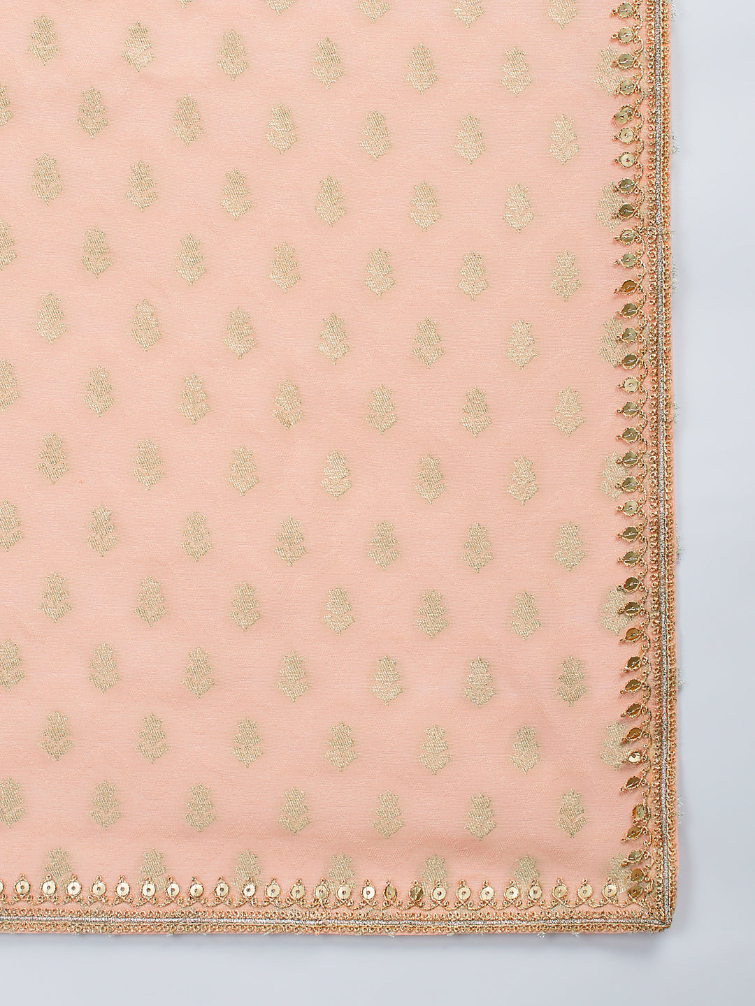 Silk blend jaquard fabric, knee length kurta, has a mandrin embroidered work collar, long sleeves, button placket, straight hem and side slits. Comes with cream solid pant style pyjama, has a button closure and partially elasticated waistband.Comes with matching silk blend dupatta with lace detailing. this ensemble is perfect for festive occasions, weddings.