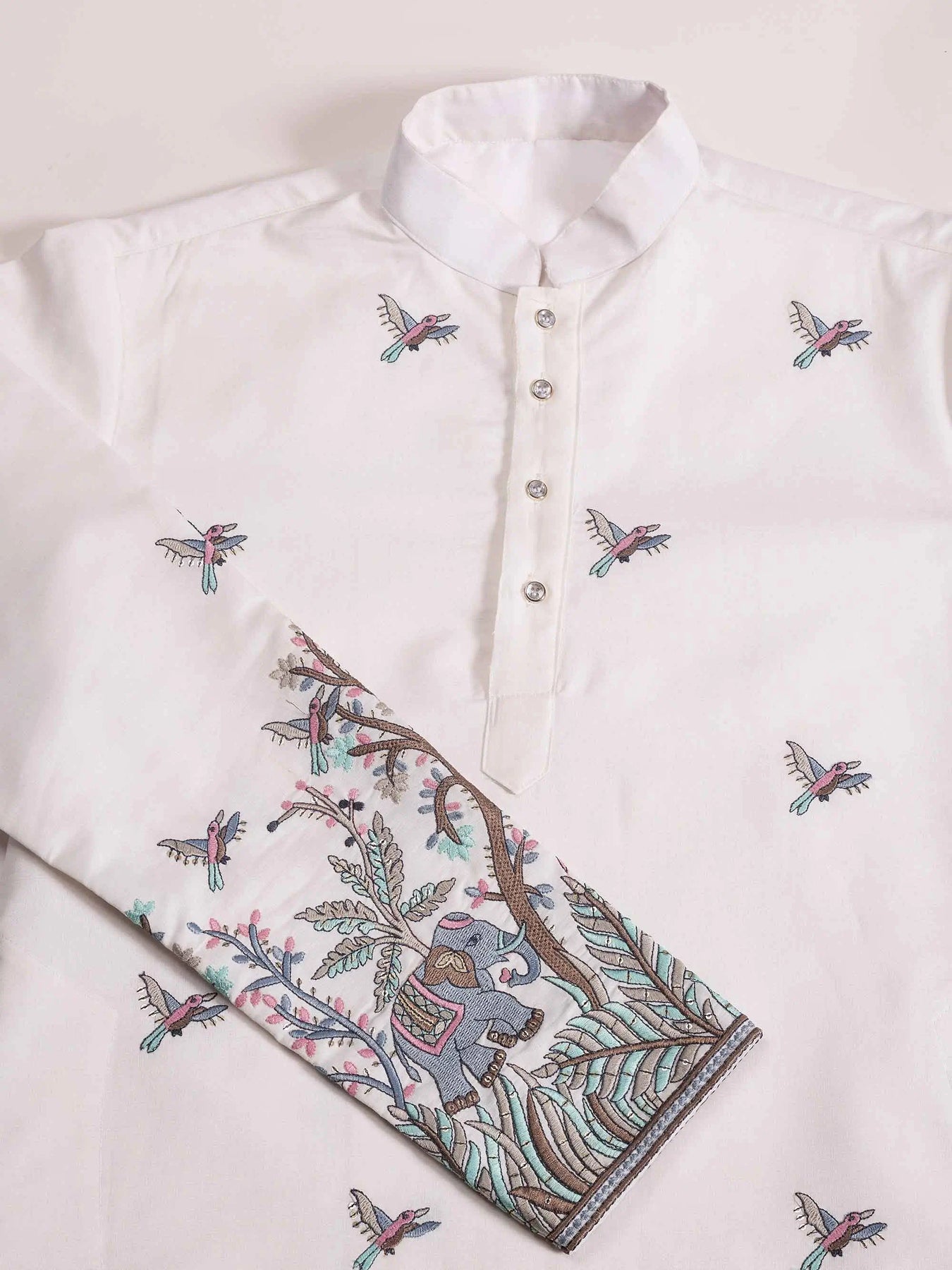 White Silk Kurta Set With Elephant Embroidery Motifs