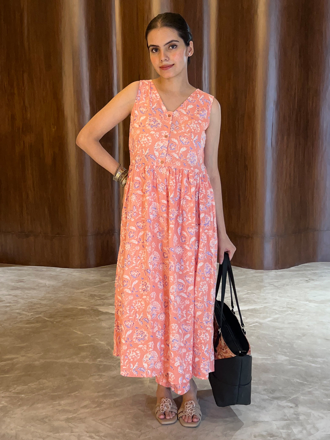 • Elevate your fashion game with the chic and contemporary coral cotton floral printed A-line kurta and bottom. The floral printed kurta features a stylish V-neck design with sleeveless style, two side pockets with gathers on the waist, and button ornamentation exuding sophistication and charm. Complemented with matching narrow pants style it by adding your favorite accessories and a pair of heels to accentuate your style and make a fashion statement wherever you go.