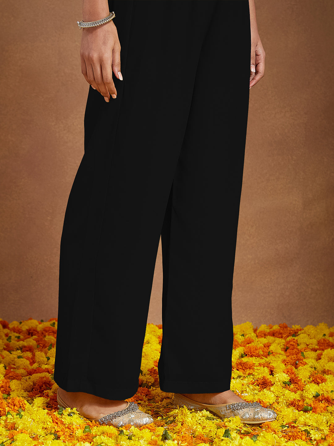 • Elevate your festive elegance with this stunning black a-line georgette suit set by Janasya. The a-line kurta with crepe lining features an embroidered patch at the yoke with intricate zari embroidery and a touch of sequins, giving it a regal charm. The round neckline and three-quarter sleeves are enhanced with golden lace at the hem, adding a refined touch. Thoughtfully designed with a side slit , this kurta blends beauty and functionality seamlessly. The ensemble is paired with solid black georgette straight pants with a comfortable drawstring waist and crepe lining, and a black chiffon dupatta adorned with delicate lace detailing on the borders, completing the look with fluid grace. Pair this outfit with statement chandbalis or jhumkas, a stack of golden bangles, and embroidered juttis or embellished heels for a complete festive look. Perfect for celebrations, evening functions, or intimate gatherings.