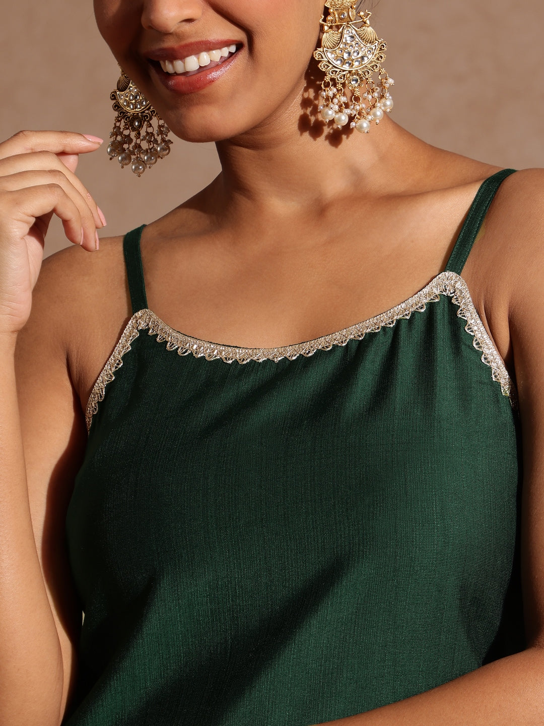 • Turn heads in this bottle green straight kurta set from Janasya, crafted in a luxurious silk blend fabric. Featuring a round neckline trimmed with delicate gold lace, the sleeveless kurta is styled with slim straps for a contemporary touch. The straps are adjustable to ensure the perfect fit. Paired with matching narrow pants, designed with a semi-elasticated waist for comfort and ease and a side pocket for functionality. The highlight is the organza dupatta adorned with elegant gold zari threadwork in scattered floral vines, and a delicate touch of sequins adds the right amount of shimmer to the ensemble. Complete the look with statement chandbalis and a cocktail ring.