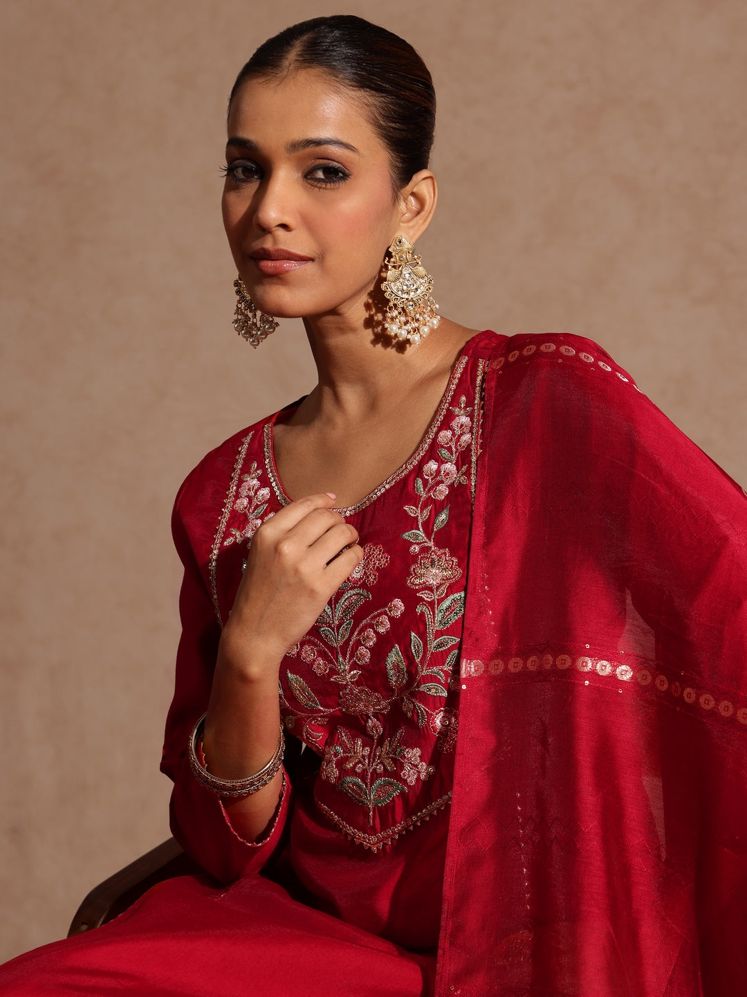 • Embrace elegance with this stunning maroon chanderi straight kurta set from Janasya. Crafted in a luxurious chanderi fabric, the kurta features exquisite floral embroidery at the yoke, delicately enhanced with subtle sequins. The round neckline complements the regal appeal, while golden lace adorns the princess lines and sleeve hems for added richness. With a flattering straight silhouette and three-quarter sleeves. It is paired with a solid maroon narrow pant made from matching chanderi fabric, designed with a convenient side pocket. The look is completed with a jacquard dupatta featuring understated stripe-like motifs and a touch of sequins for a subtle festive shimmer. Complete your look with statement jhumkas, gold-toned bangles, and embellished juttis. Ideal for festive occasions, intimate gatherings, or family celebrations where timeless sophistication is key.