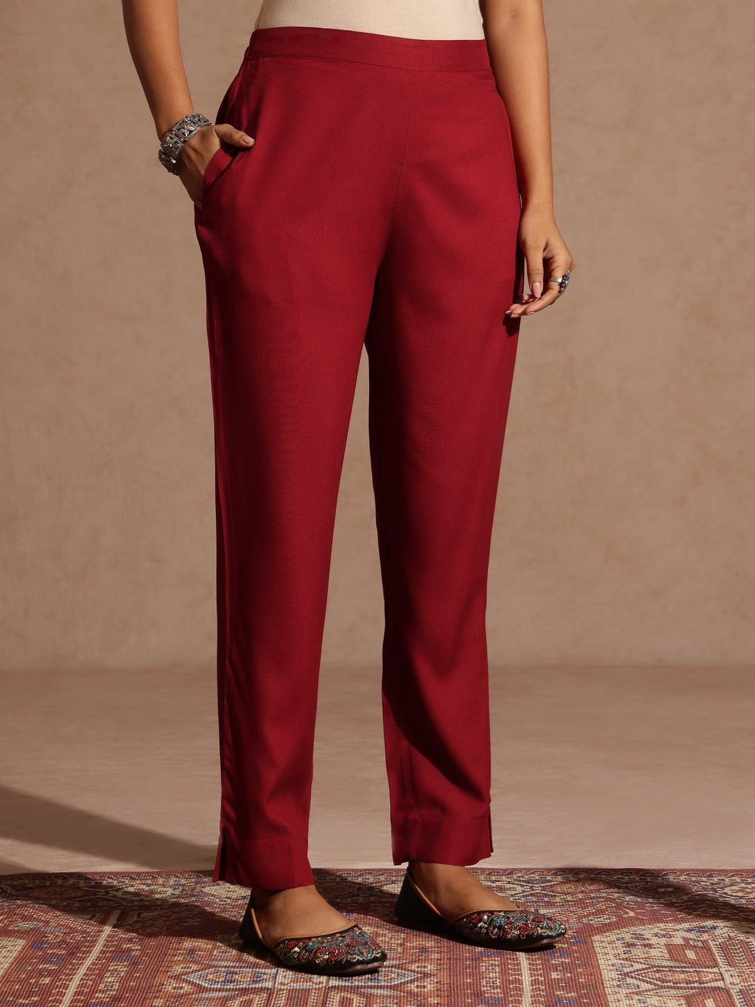 • Brighten up your festive wardrobe with this elegant maroon straight suit set from Janasya. Made from soft rayon fabric, the kurta features a classic round neckline adorned with intricate embroidery on the yoke, while delicate sequins and small embroidered motifs add charm across the fabric. Designed with three-quarter sleeves, a calf-length cut, and a regular fit, it offers timeless elegance with everyday comfort. The set is paired with solid maroon straight pants crafted in rayon, featuring a semi-elasticated waist, side slit, and a functional pocket. Completing the look is a solid maroon chiffon dupatta, finished with a subtle lace border. Style this look with pearl earrings and mojaris for a traditional yet modern flair making it a graceful choice for festive occasions.