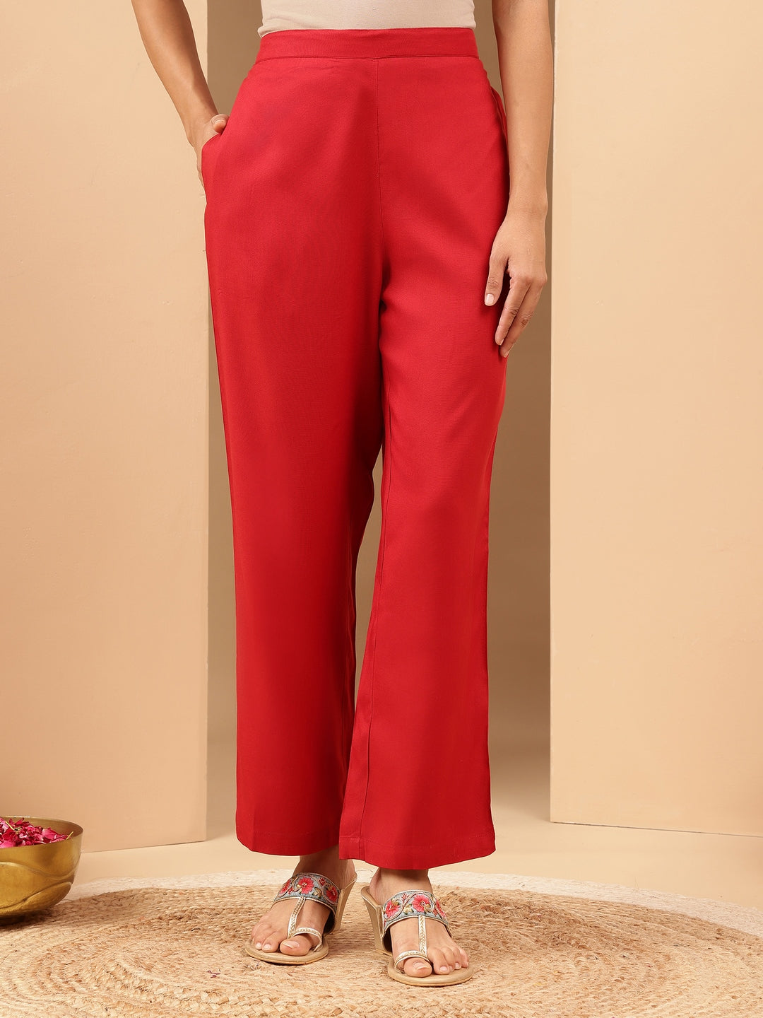 • Make a striking statement with this maroon straight kurta set from Janasya, crafted in soft, breathable rayon fabric. The v-neckline is elevated with a mirror-embellished placket adorned in intricate zari work, creating a festive focal point. The three-quarter sleeves feature matching mirror and zari detailing on the hem, adding charm and elegance. Paired with a solid maroon straight-fit pant featuring a semi-elasticated waist for all-day comfort. Completing the set is a cotton dupatta bordered with lace that adds fluidity and flair. Pair with oxidized jhumkas and a bold mirror ring for a head-turning traditional look.