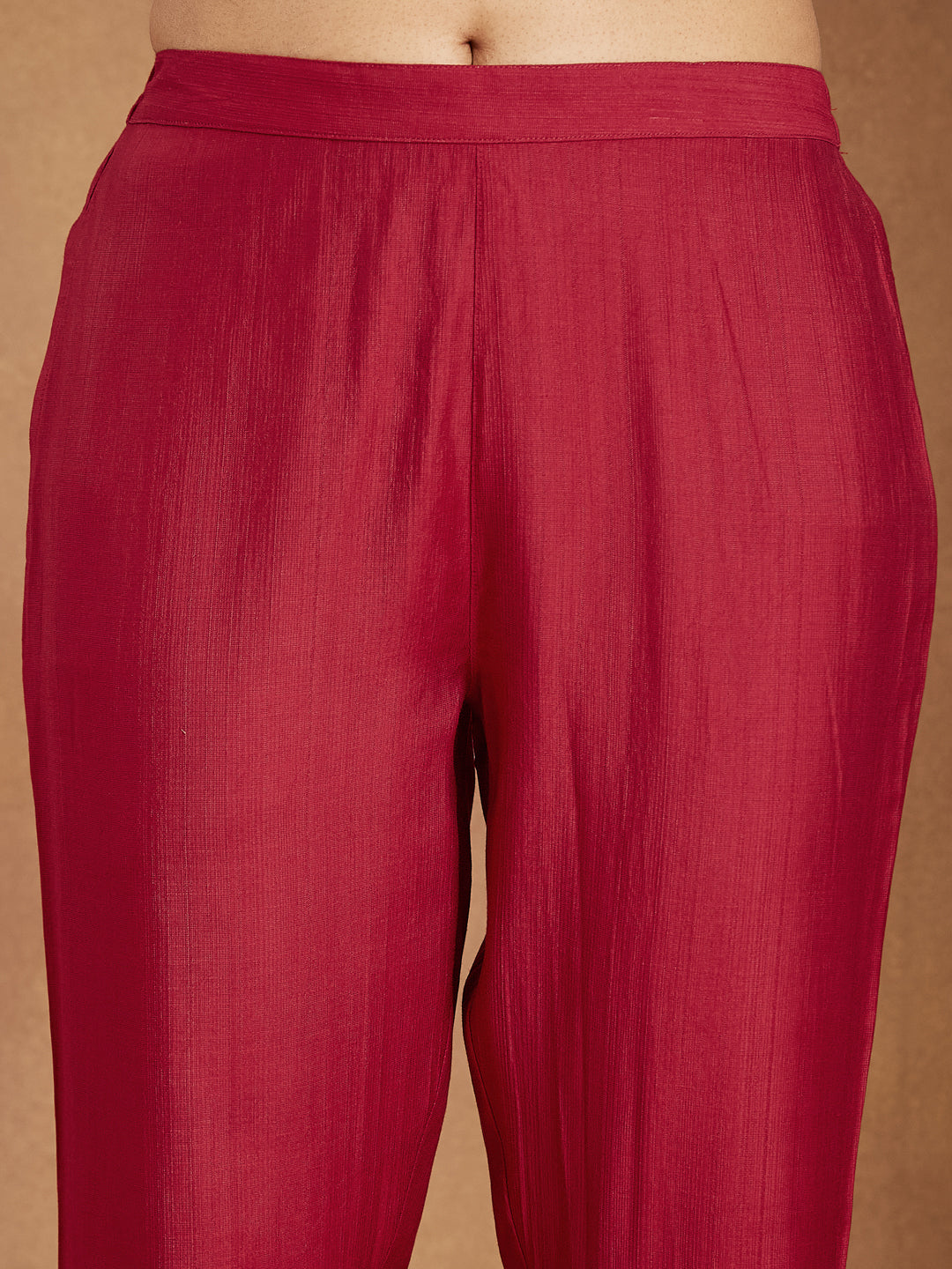 • Grace your festive wardrobe with this elegant red silk blend straight kurta set from Janasya, crafted to bring sophistication and grandeur to your ethnic collection. The kurta features a refined notch neckline, exquisitely highlighted with intricate zari embroidery and subtle sequin accents that shimmer beautifully under light. Delicate gota patti lace further enhances the yoke, adding a traditional festive touch. Designed in a graceful calf-length silhouette, the kurta comes with 3/4th sleeves adorned with matching gota patti borders, striking the perfect balance between comfort and sophistication. It is paired with solid red narrow pants tailored with a side slit for ease of movement, a semi-elasticated waist for a secure fit, and a functional pocket for everyday utility. Completing the ensemble with a luxurious jacquard red dupatta, richly woven with floral motifs that lend depth and opulence to the overall look. Ideal for weddings, grand festivities, and celebratory evenings, this ensemble pairs beautifully with statement earrings, embellished juttis, and a sleek clutch, making it a standout choice for any special occasion.
