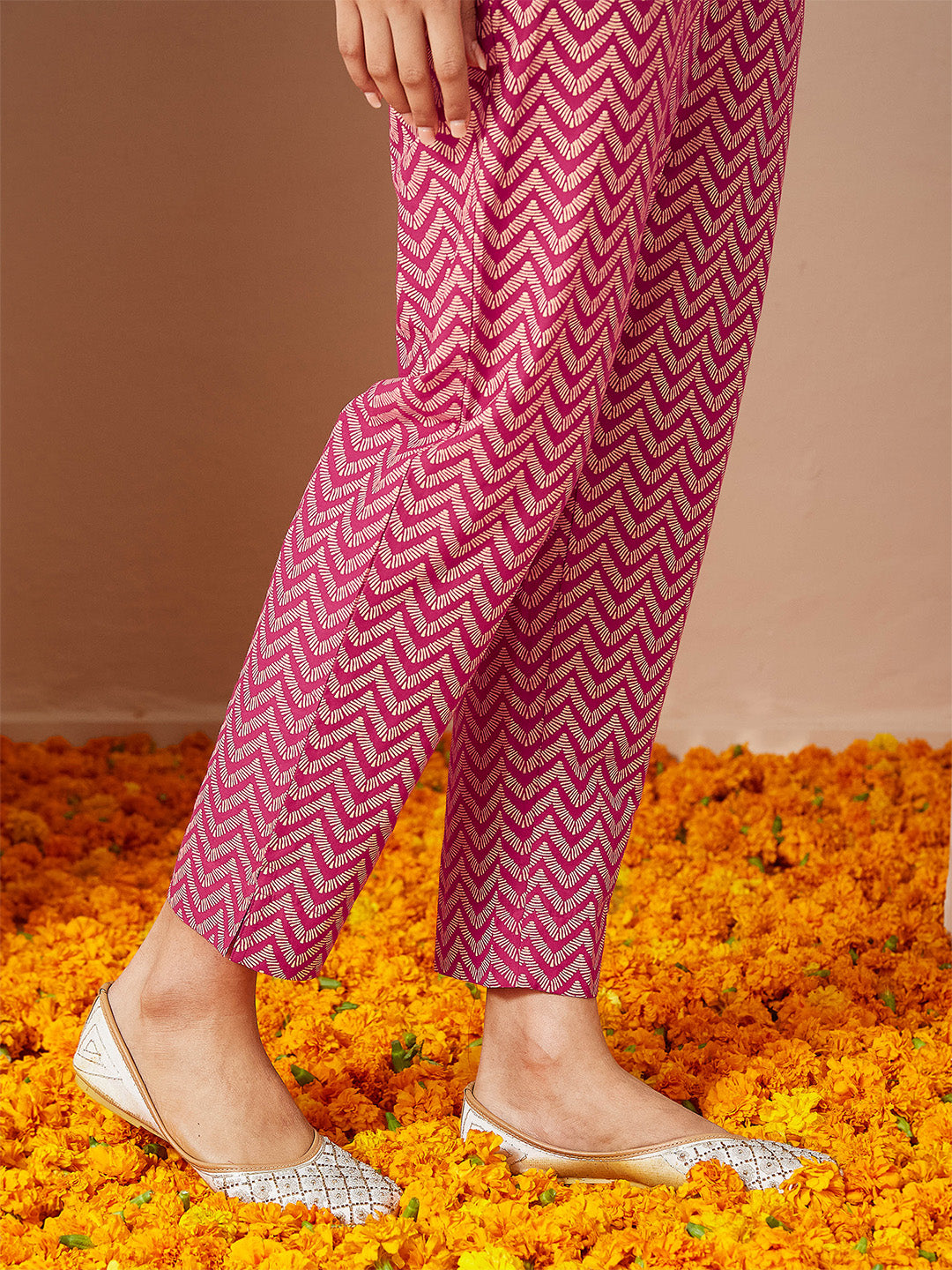 • Add an ethnic charm to your wardrobe with this exquisite pink pure cotton a-line kurta set from Janasya. The a-line kurta is beautifully adorned with intricate floral prints and a notch neckline detailed with golden lace and subtle sequin work, lending a festive shimmer. A standout feature is the attached short chevron-printed jacket overlay, styled with dori and tassels, further highlighted with golden lace and sequins for a layered, elegant appeal. The three-quarter sleeves with matching lace accents and a practical side pocket balance beauty with ease. Paired with chevron-printed narrow pants and a coordinating cotton dupatta blending floral and chevron motifs, this set makes a striking statement. Perfect for festive occasions, family gatherings, and daytime functions, it’s best styled with oxidized earrings, juttis, and a bold statement ring for a complete festive-ready look.