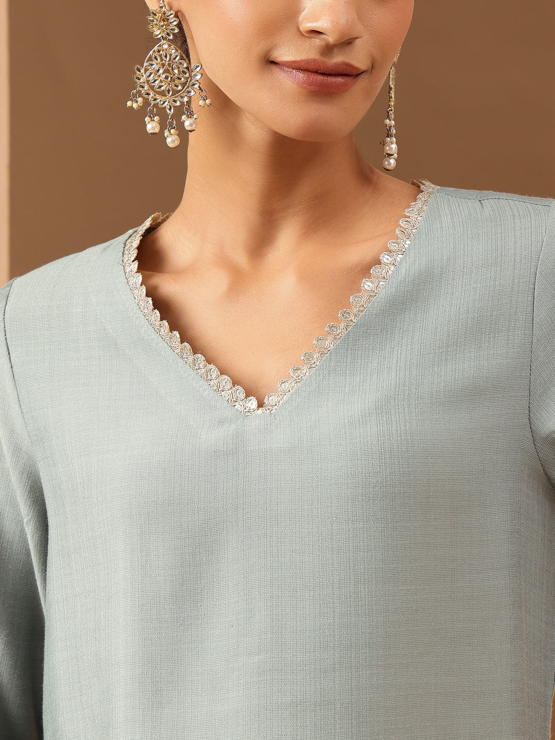 - The true highlight is the jacquard fabric dupatta adorned with an all-over floral print, complemented elevate your festive elegance with this powder blue silk blend straight kurta set by Janasya. The kurta features a timeless v-neckline accentuated with delicate lace, echoed again on the three-quarter sleeves for a cohesive look. Crafted in a luxe silk blend fabric, the kurta offers a refined silhouette with clean straight lines. Paired with a solid powder blue narrow pant with a handy side pocket, this set ensures both grace and comfort by jacquard borders and scattered motifs throughout, adding a regal charm to your ensemble. Style it with statement silver jhumkas, a dainty clutch, and strappy block heels for a complete festive look. Whether it’s a daytime celebration or an evening gathering, this ensemble strikes the perfect balance between minimalism and elegance.