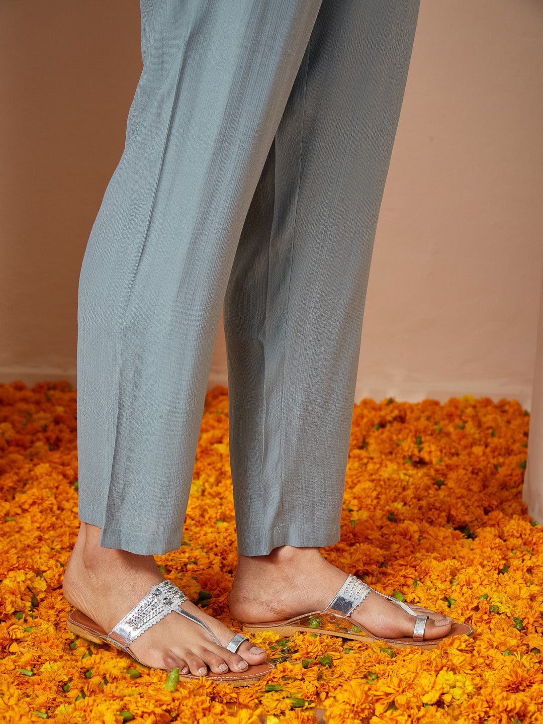 • Exude serene elegance with this powder blue silk blend straight kurta set by Janasya. The kurta features a round neckline adorned with intricate white embroidery on the yoke, complemented by delicate floral motifs scattered all over. The center panel and side panels showcase rich white thread embroidery with detailed floral and geometric patterns, adding a graceful charm. The lace detailing on the hem and sleeves enhances its sophisticated appeal. Paired with powder blue straight pants featuring a semi-elasticated waist and side pocket, and a matching silk-blend dupatta with lace borders. Style this look with statement silver jhumkas and bangles for a refined festive ensemble.