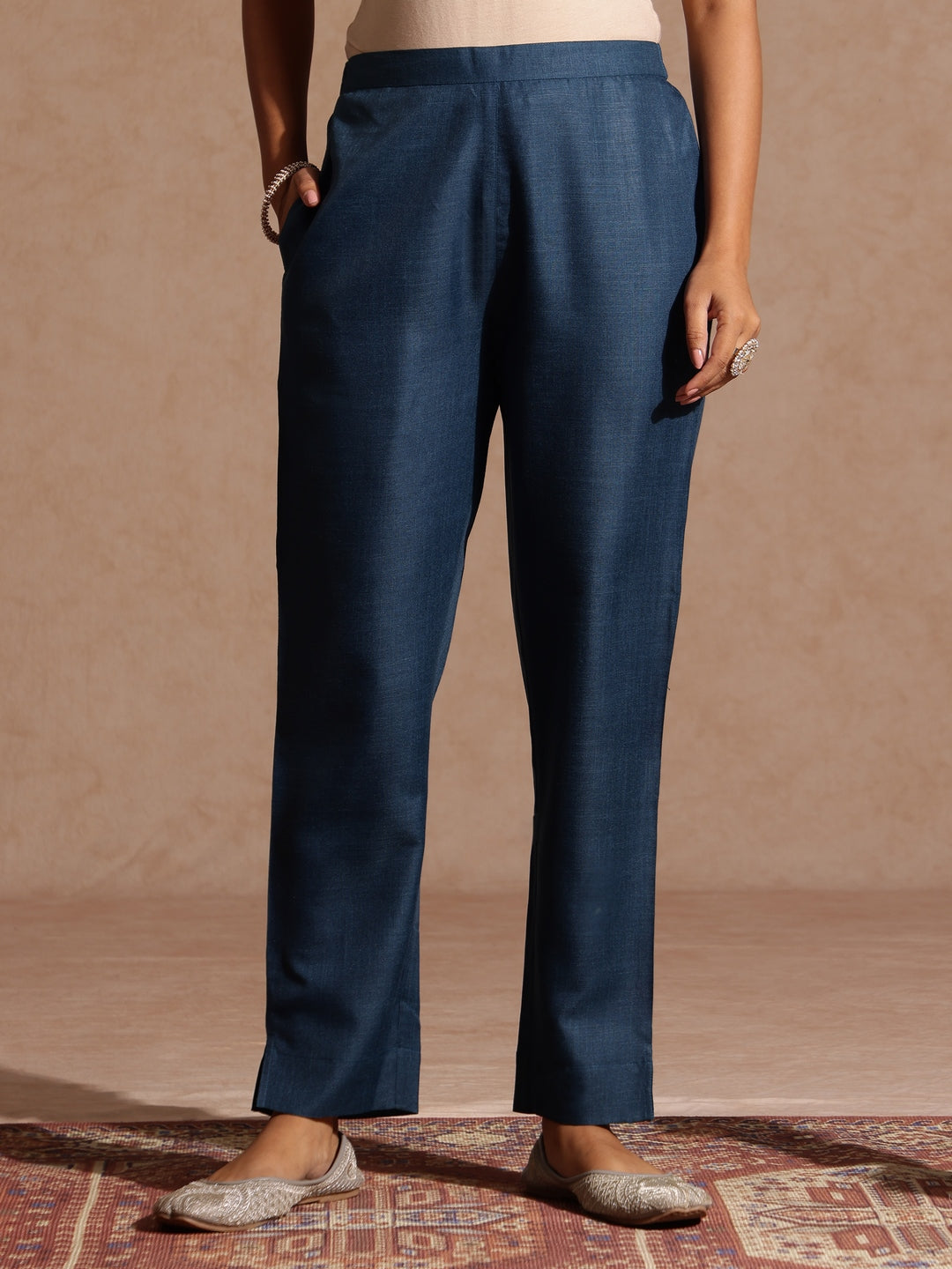 • Make a subtle statement with this elegant teal cotton blend straight kurta set from Janasya. The kurta features a stylized round neckline with a notched slit, highlighted by delicate gota lace running along the neckline and sleeve hems for a refined festive touch. The wooden button detailing along the placket adds a charming accent to its minimal design. The three-quarter sleeves maintain a clean, structured silhouette while offering ease of movement. The kurta is paired with solid teal narrow pants designed with a semi-elasticated waistband and a side pocket for added functionality and comfort. Completing the ensemble is a stunning organza dupatta adorned with an all-over floral print and scattered jacquard motifs, finished with intricate jacquard borders that elevate its festive flair. Style this set with silver jhumkas, bangles, and embroidered juttis to embrace timeless elegance for festive gatherings or special occasions.