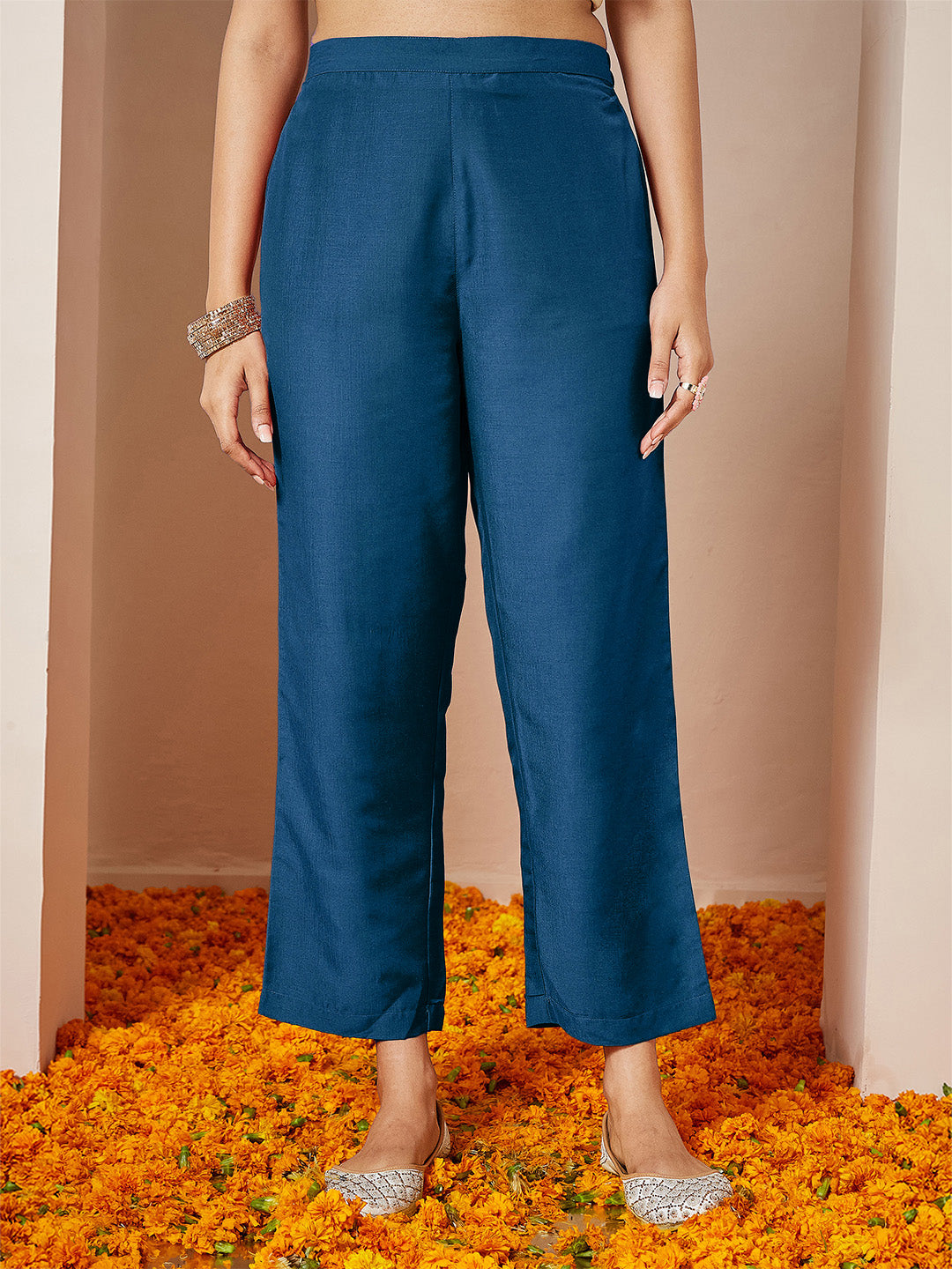 • Designed for comfort yet crafted with festive detailing, this teal blue silk blend a-line kurta set from Janasya. The kurta is adorned with all-over gold foil printed ethnic motifs that exude timeless charm, while the yoke is beautifully highlighted with intricate golden floral zari embroidery and delicate sequin accents for a subtle shimmer. A graceful notch neckline enhances its refined appeal, and three-quarter sleeves finished with gota patti borders add a festive flourish. Designed in a flattering a-line silhouette with a practical side pocket, this kurta blends utility with sophistication. It is paired with solid teal blue silk-blend straight pants for a sleek balance and a lightweight chiffon dupatta trimmed with gota patti lace along the edges, completing the look with finesse. Perfect for festive gatherings, family celebrations, or cultural occasions, this ensemble pairs beautifully with traditional jhumkas, a statement kada or bangle stack, and embellished juttis.