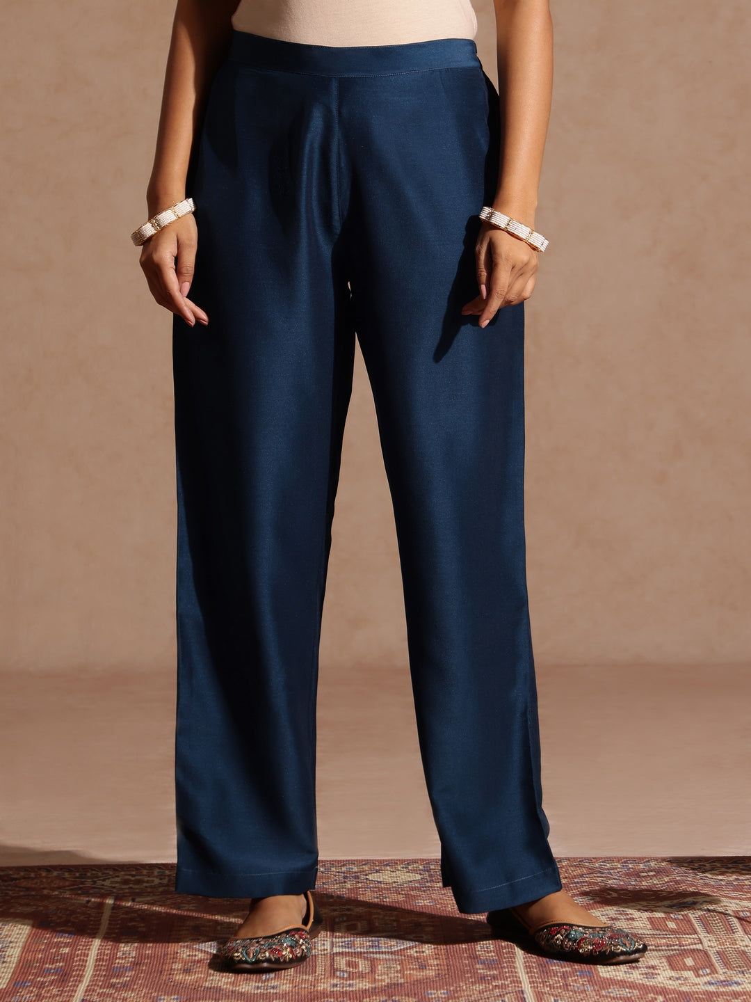 • Bring an ethnic charm to your wardrobe with this stunning teal blue anarkali suit set from Janasya. Crafted in rich muslin fabric, the kurta features intricate embroidery with sequins and zari at the yoke, beautifully enhancing its notch neckline. The body of the kurta showcases elegant foil prints all over, adding a festive shimmer. Designed for comfort and style, it has three-quarter sleeves with golden lace at the hem, a side pocket, and a flattering flare. The kurta is paired with solid teal muslin straight pants that complement its rich tone. Completing the ensemble is a chiffon dupatta adorned with a delicate golden lace border that adds a touch of elegance. Pair this ensemble with statement jhumkas, metallic heels, and a box clutch for weddings or festive gatherings.