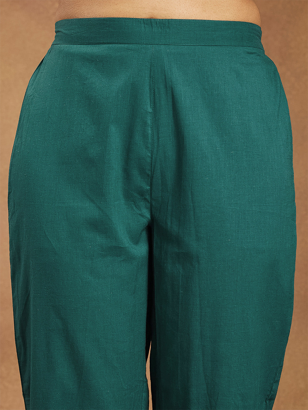 • Elevate your ethnic wardrobe with this stunning teal green pure cotton anarkali set from Janasya. Featuring an anarkali silhouette, the kurta is adorned with elegant floral prints and detailed with intricate zari, sequin, and gota patti lace on the yoke. The notch neckline and three-quarter sleeves with silver gota patti lace add a refined touch, while a functional side pocket adds convenience. Paired with a pure cotton solid narrow green pant, a flowy chiffon dupatta in ombré cream and sage green finished with delicate gota lace at the border and a matching printed scrunchie, the set ensures style and comfort. Perfect for festive and semi-formal occasions.