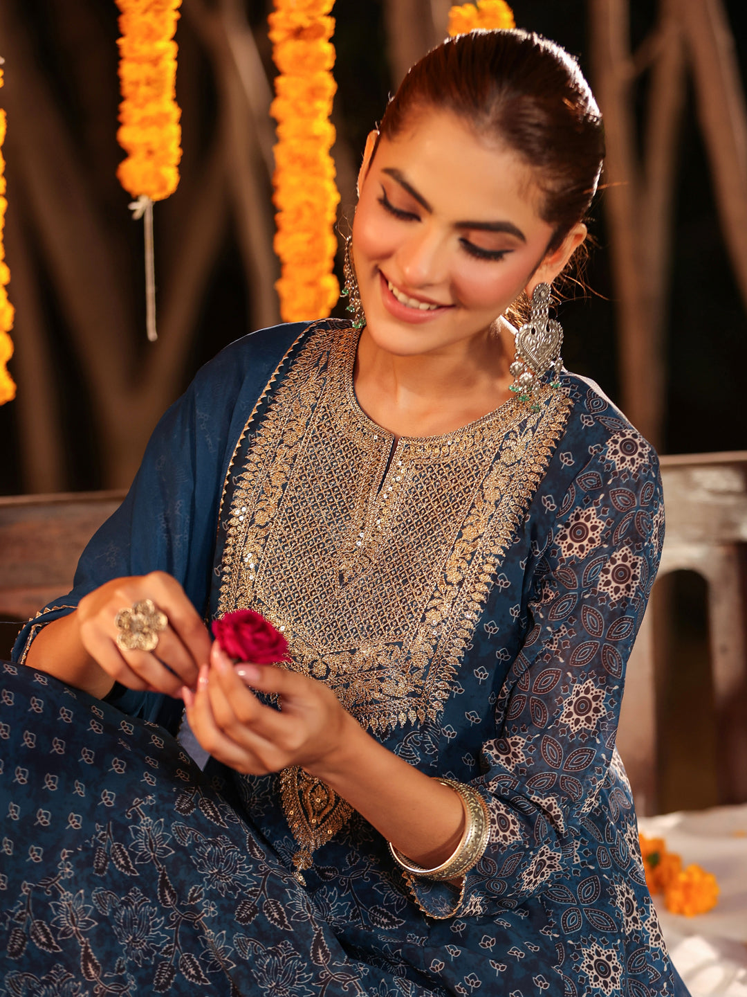 Janasya Women's Dark Blue Georgette Ajrakh Printed Embellished Anarkali Kurta Set