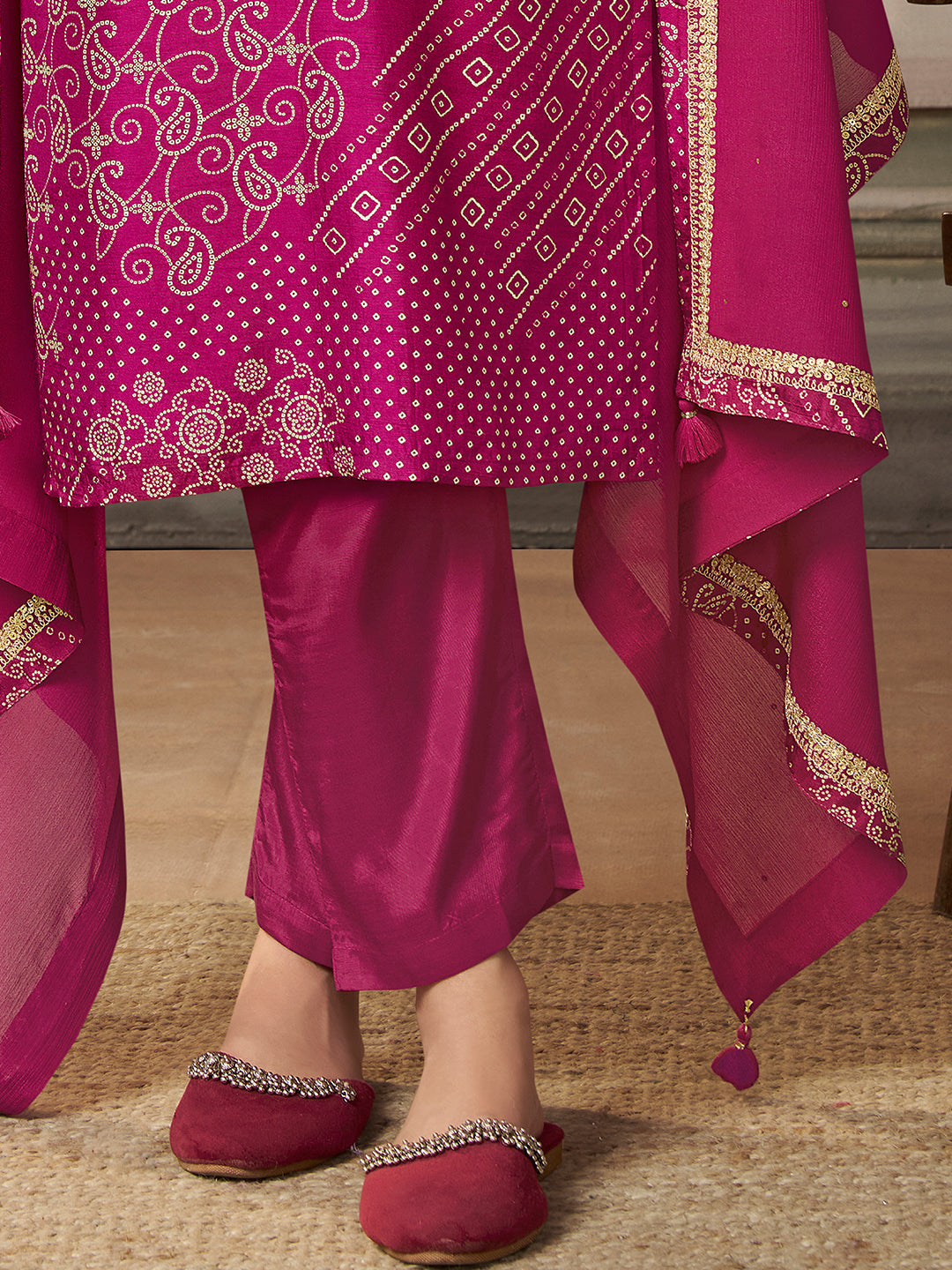 Pink Dola Silk Digital Bandhni Printed Top With Embroidery on Yolk and Sleeves. Paired with Santoon Bottom and Chinon Dupatta with Sequins work Embroidery Lace & Tessels