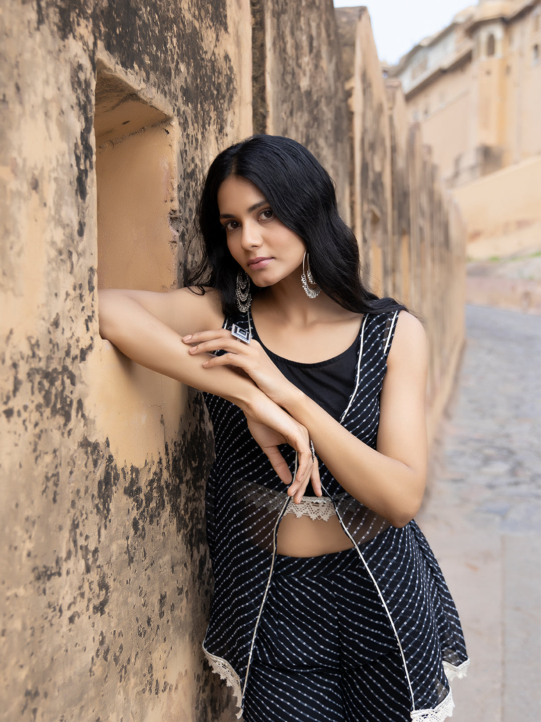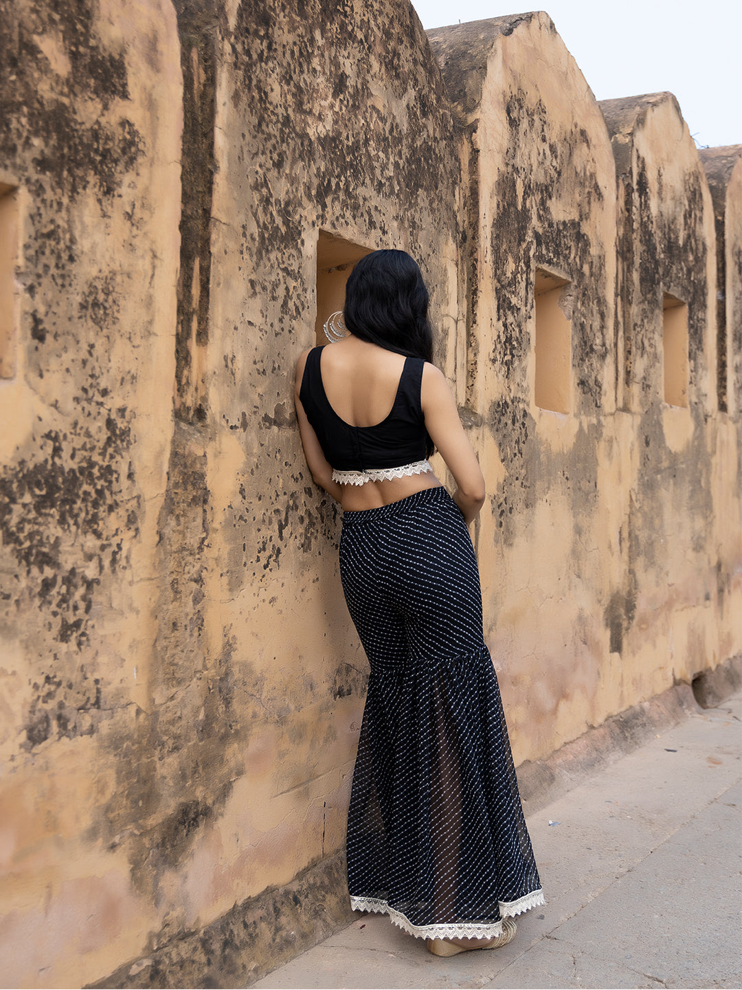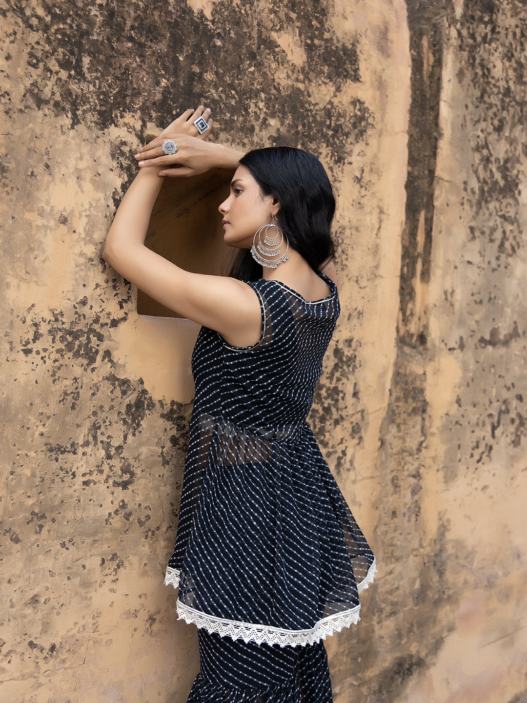 Nihira black leheriya printed top with sharara, both made of georgette.