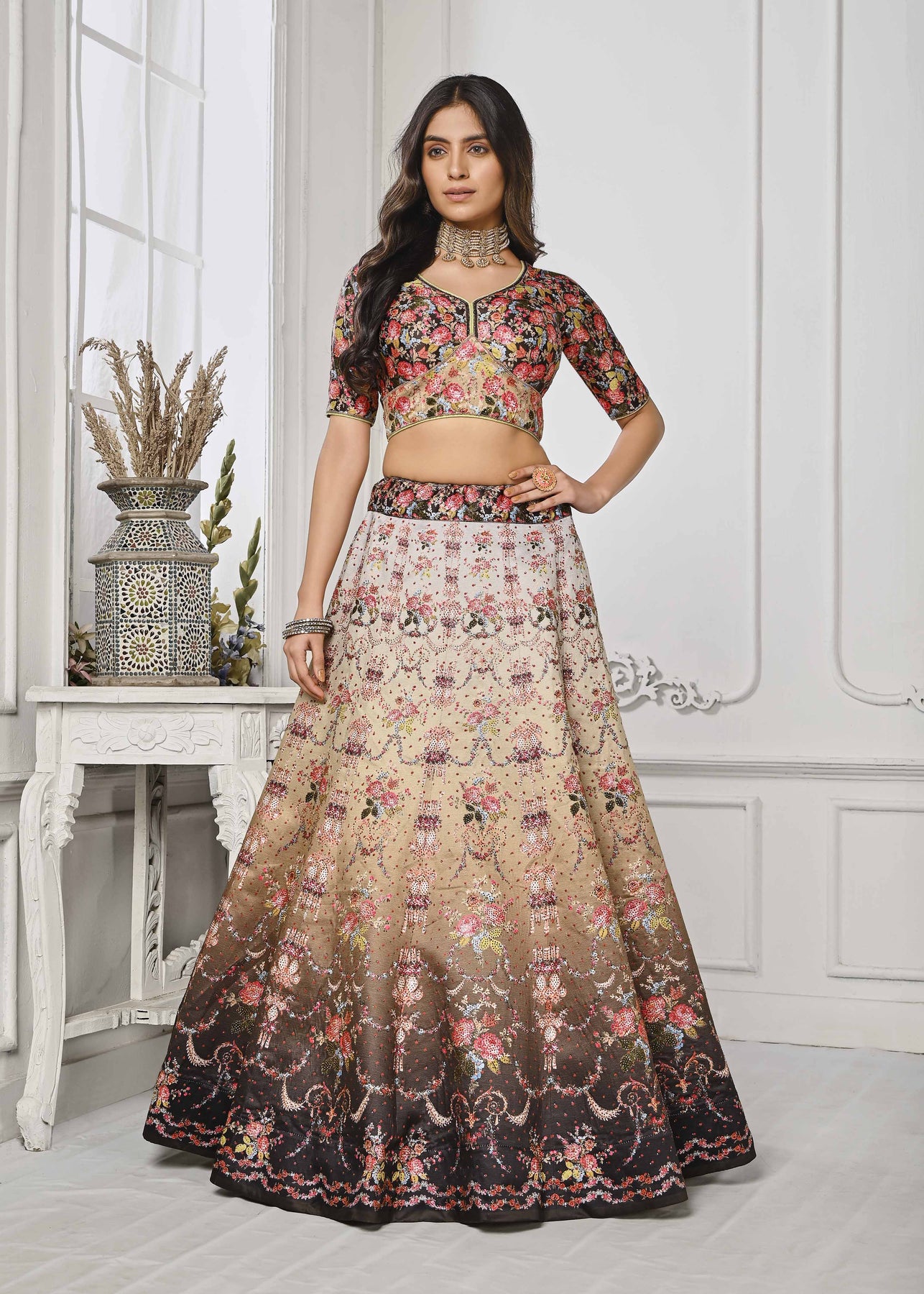 Elevate your ethnic elegance with this exquisite ensemble, crafted from the finest pure satin silk fabric. Adorned with intricate digital prints that dance across the fabric, this lehenga and blouse set exudes sophistication and charm. Each detail is meticulously crafted, from the vibrant hues to the delicate motifs, creating a mesmerizing visual spectacle.