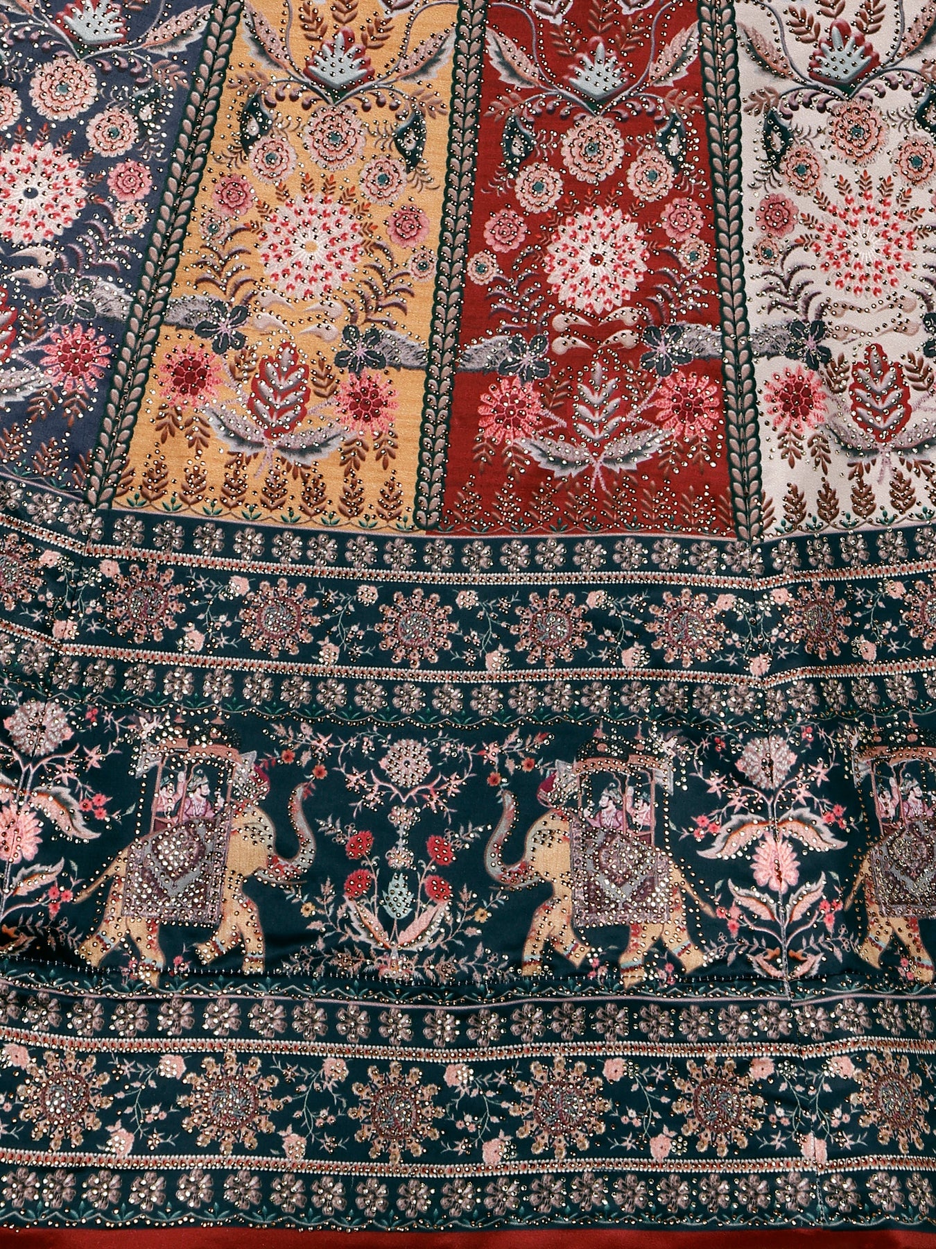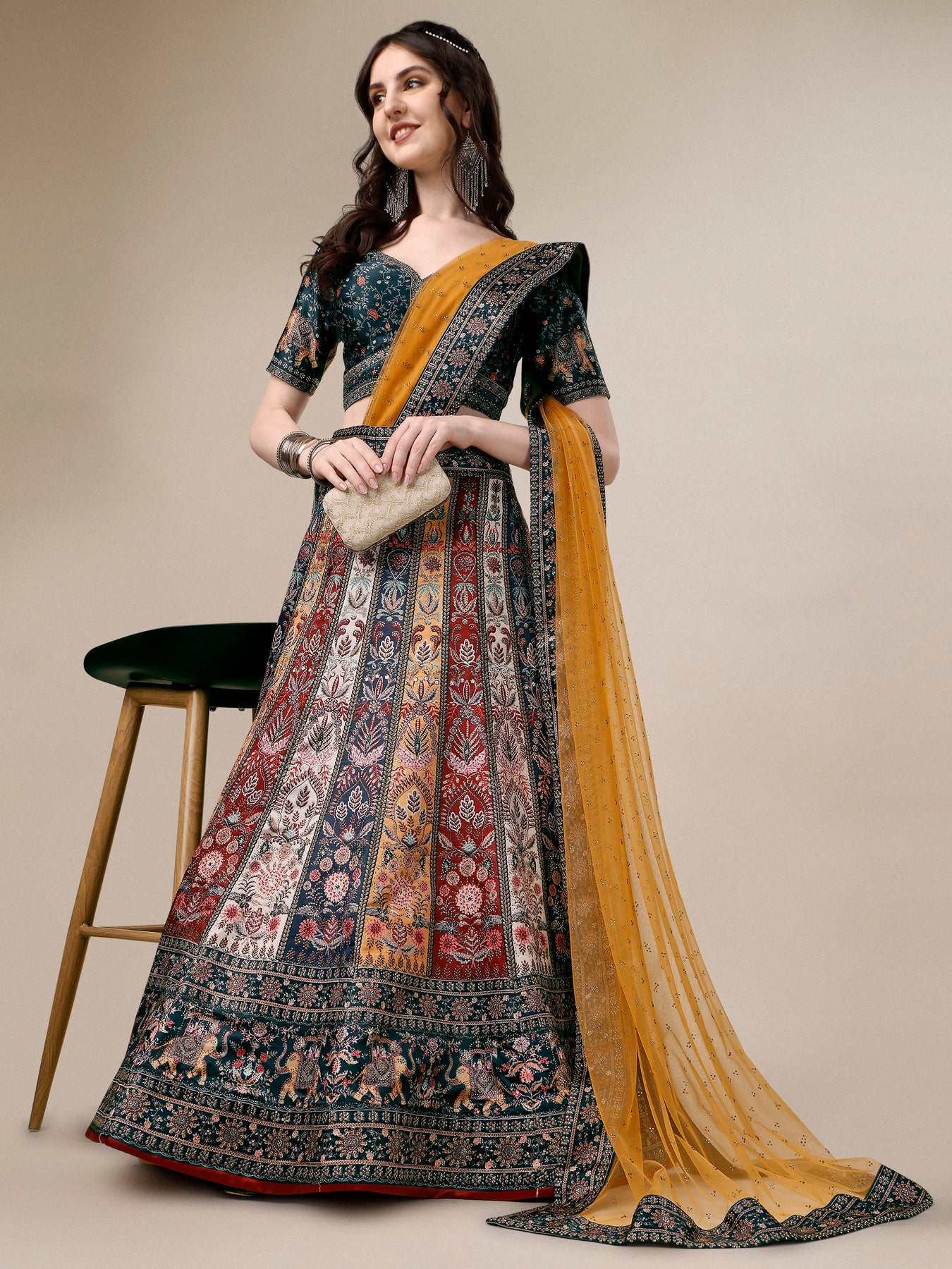 Introducing the epitome of elegance and luxury, behold the exquisite Lehenga by Label Saptrangi. Crafted from pure satin silk, this ensemble exudes opulence with every detail. The Lehenga and blouse boast a timeless allure, adorned with captivating digital prints that weave tales of tradition and modernity seamlessly.