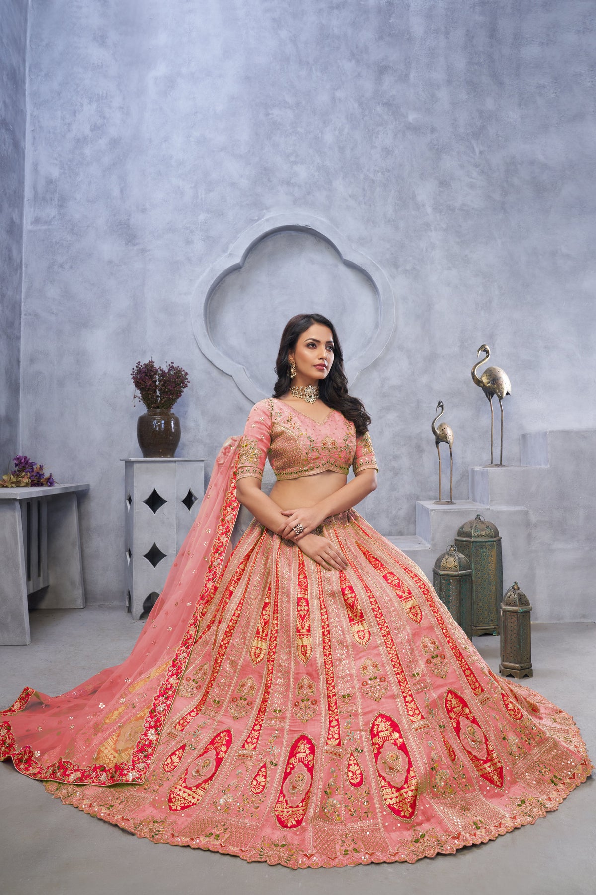 Pink Organza Silk Wedding Lehenga Choli with Paisley Motifs & Soft Net Dupatta