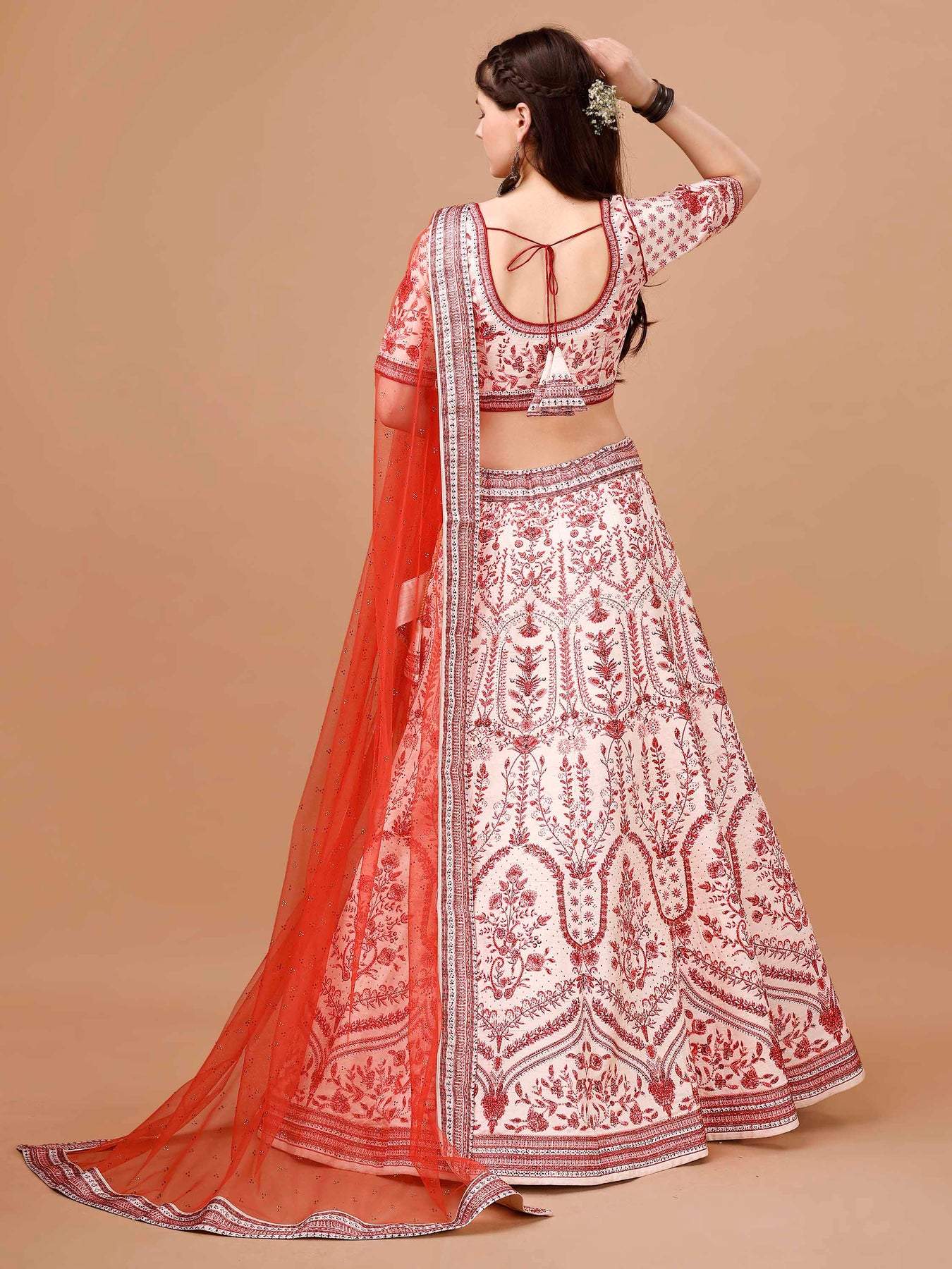 Completing the ensemble is a soft net dupatta, adorned with a border of pure satin silk featuring the same intricate digital print as the lehenga. The delicate drape of the dupatta adds a graceful flow, while the border adds a hint of regal charm.