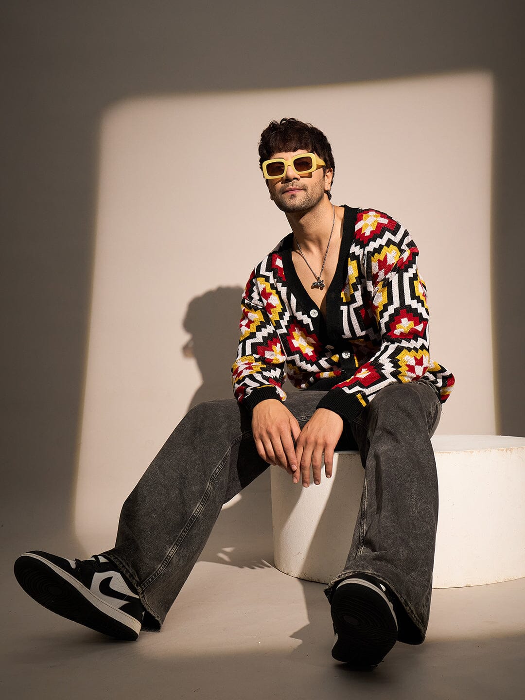 This cardigan features a black geometric pattern and is made from a blend of acrylic and wool fabric. The dropped shoulder and oversized fit provide a comfortable and relaxed look, while the knitted ribbed neckline and cuffs add texture. With full sleeves and a buttoned closure, this cardigan offers both style and functionality.