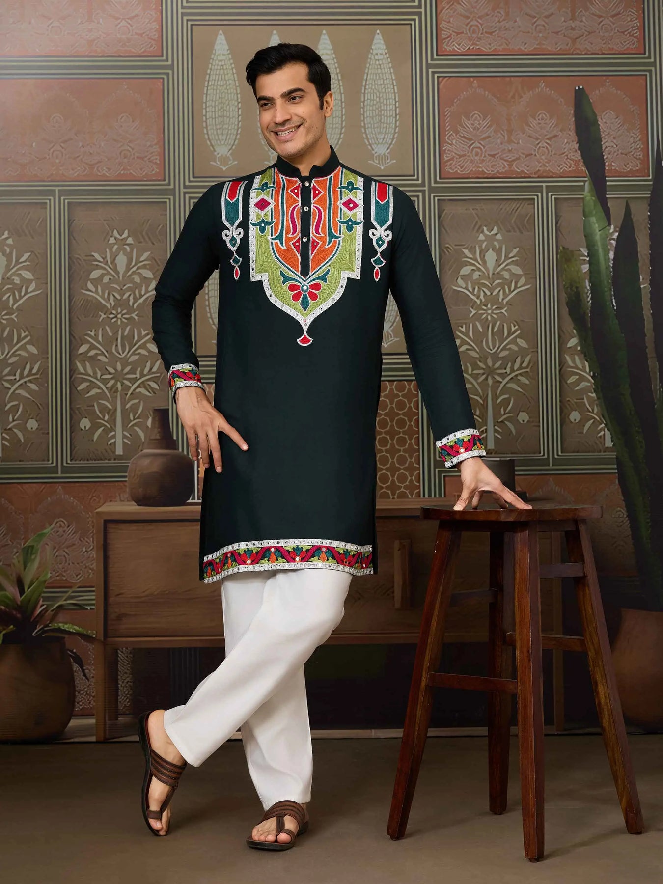 Celebrate Navratri in style with our new men’s kurta set! Crafted in soft cotton with intricate multi-thread and real mirror work, paired with comfortable cotton pants—perfect for festive garba nights.
