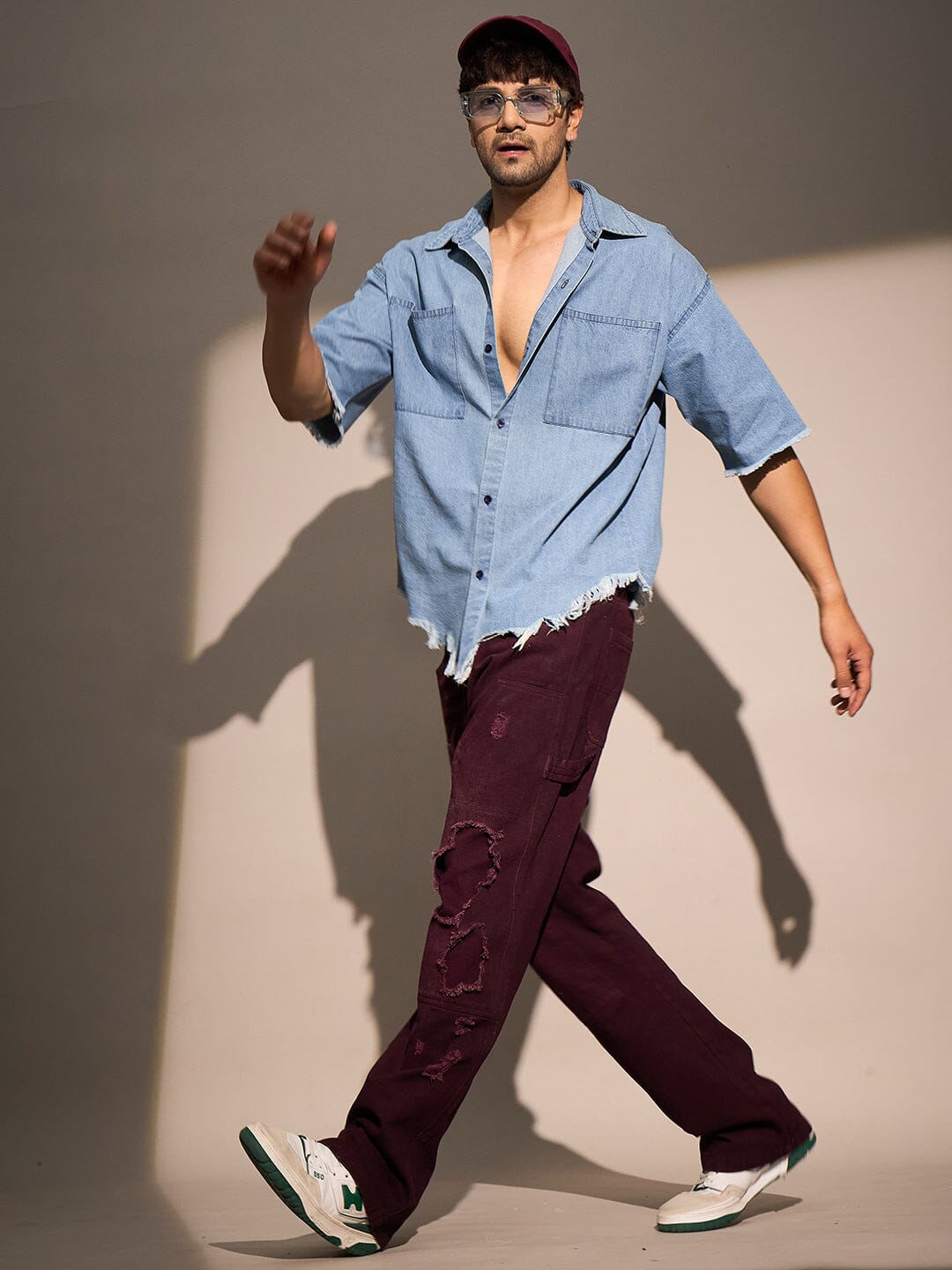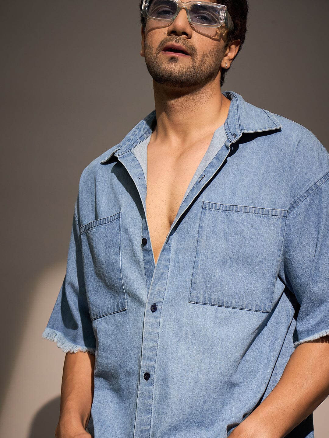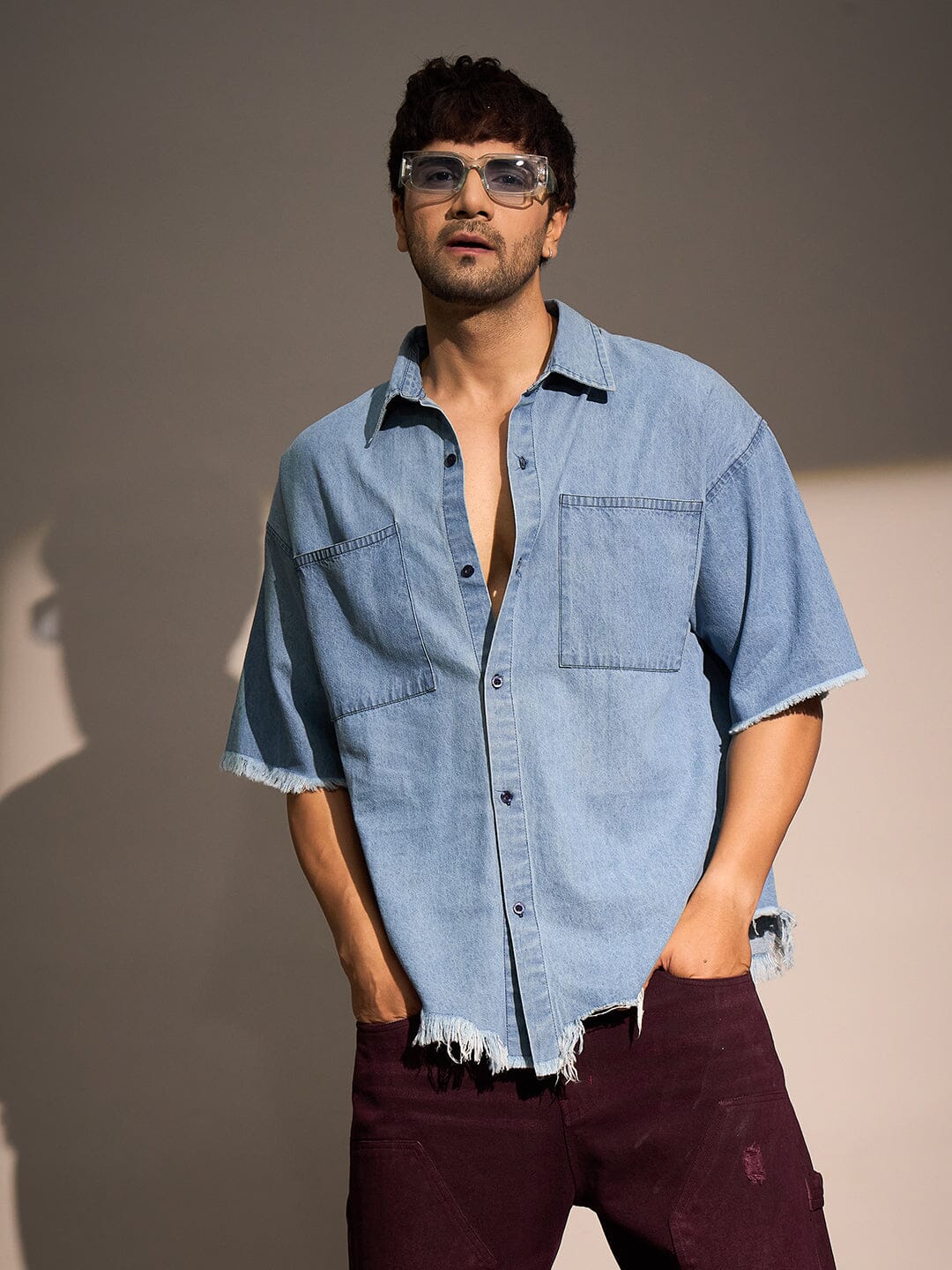Introducing the Ice Damaged Hem Short Sleeve Oversized Shirt, made with 100% Woven Cotton for an oversized, comfortable fit. Featuring contrast stitching, snap button closure, and denim-washed fabric, this shirt also has patched chest pockets and a frayed, distressed hemline with a raw-edged finish.