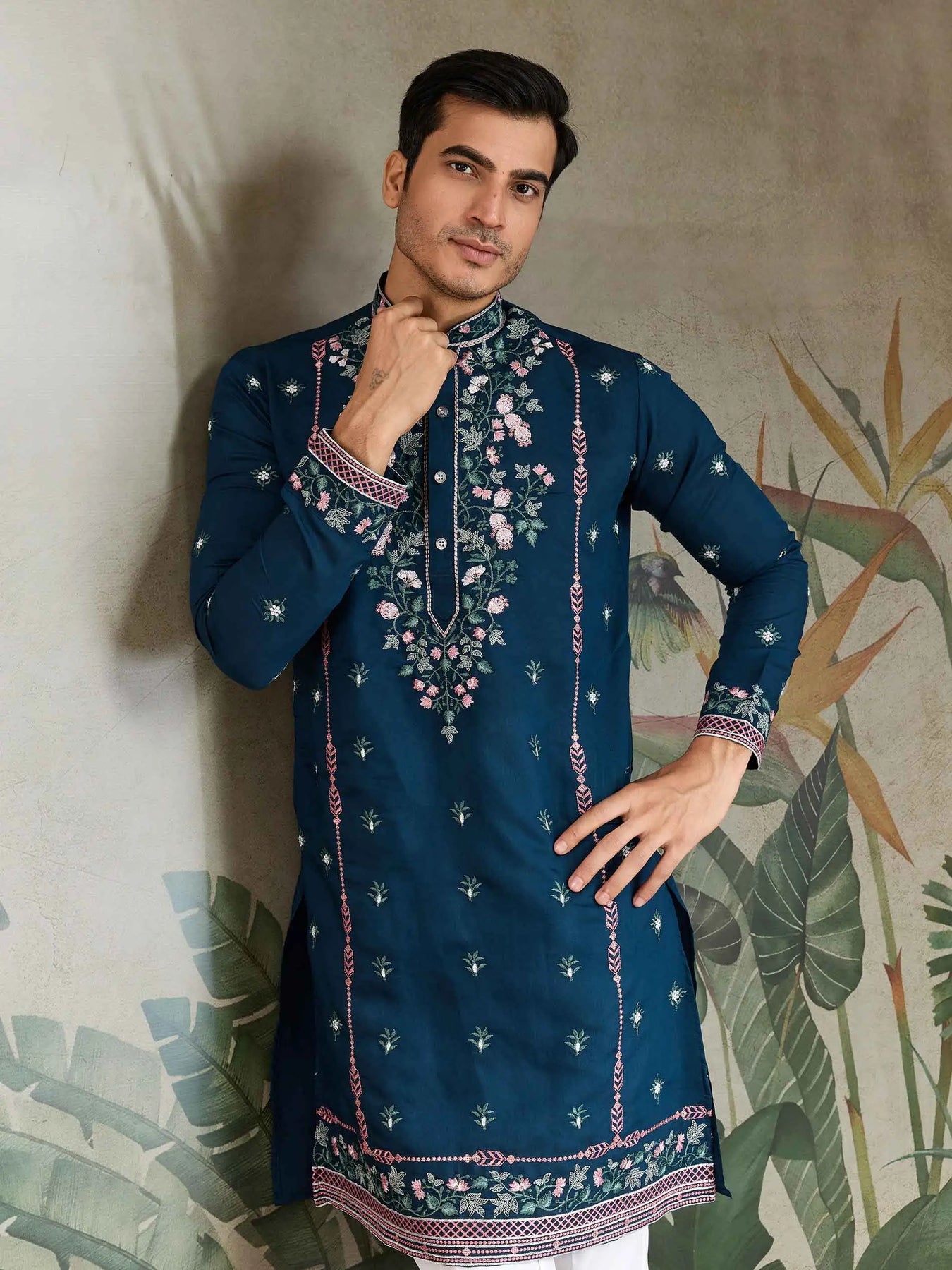 Nile Blue Viscose Silk Thread And Sequins Embroidery Work Kurta With Pant