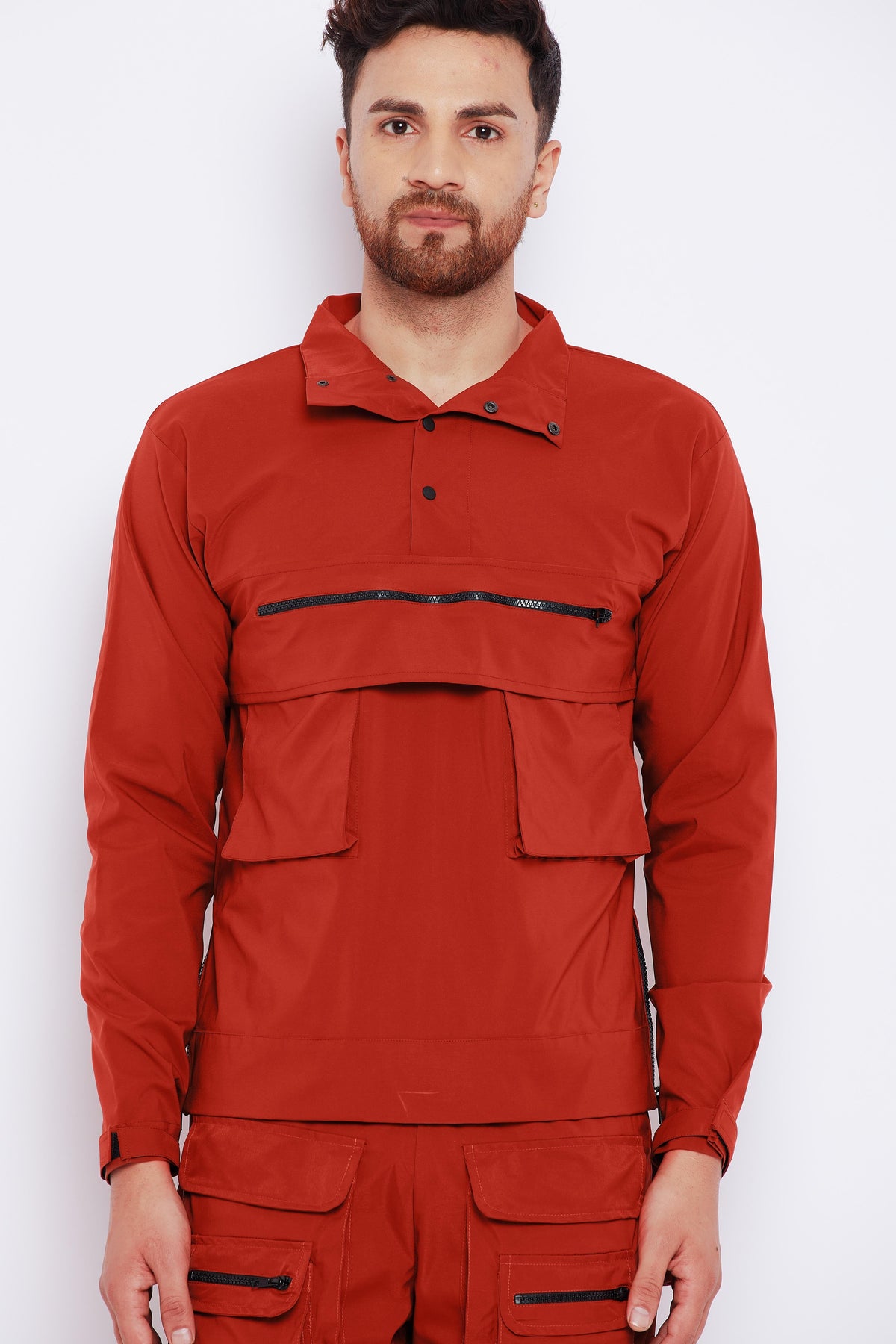 Rust solid windcheater tailored jacket with shoulder tabs, has a spread collar, 2 pockets ,has a zip closure, long sleeves, straight hemline, without lining.