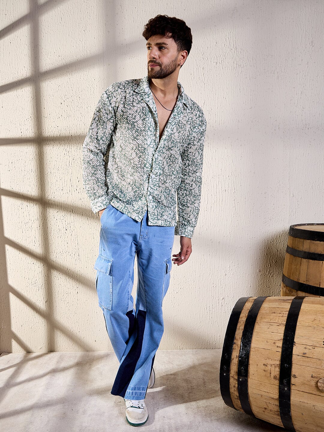 Crafted from a blend of cotton and shirting twill fabric, this white and olive floral lace shirt features a delicate allover floral pattern. A buttoned placket and Cuban collar add refined details to this elegant piece, finished with a curved hemline for a polished look.