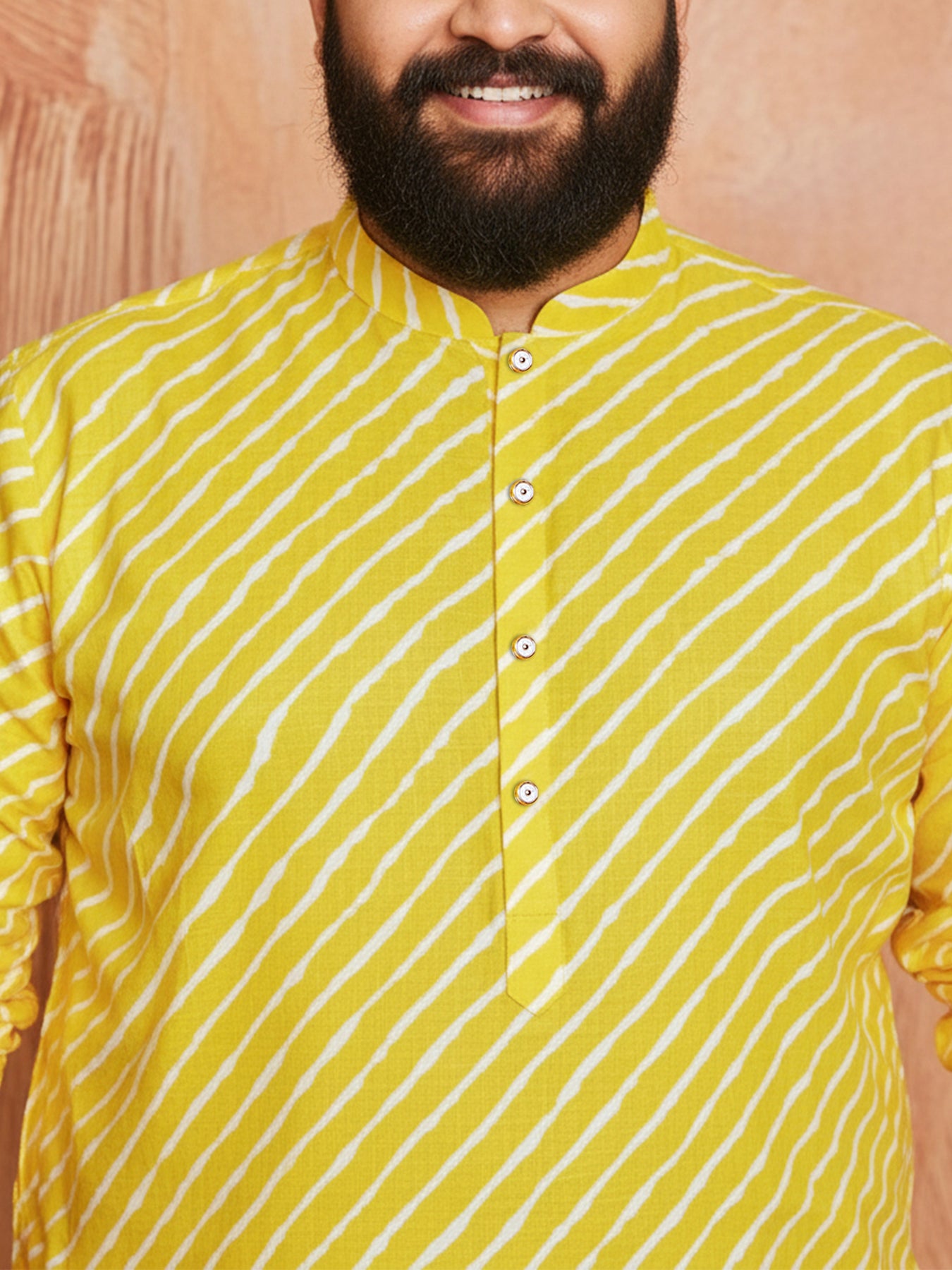 Embrace traditional prints with Vastramay's yellow lahariya kurta. Features authentic screen printed cambric cotton with comfortable button closure. Perfect blend of traditional and contemporary styling.