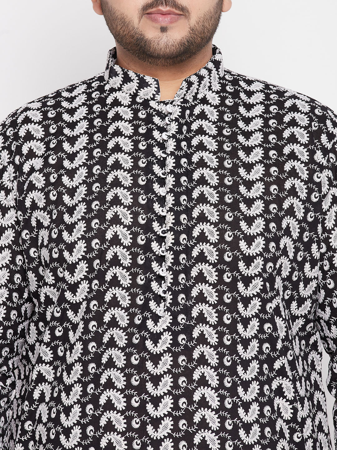 Black color chikankari embroidered straight knee length kurta, has a mandarin collar, long sleeves, button placket, straight hem.