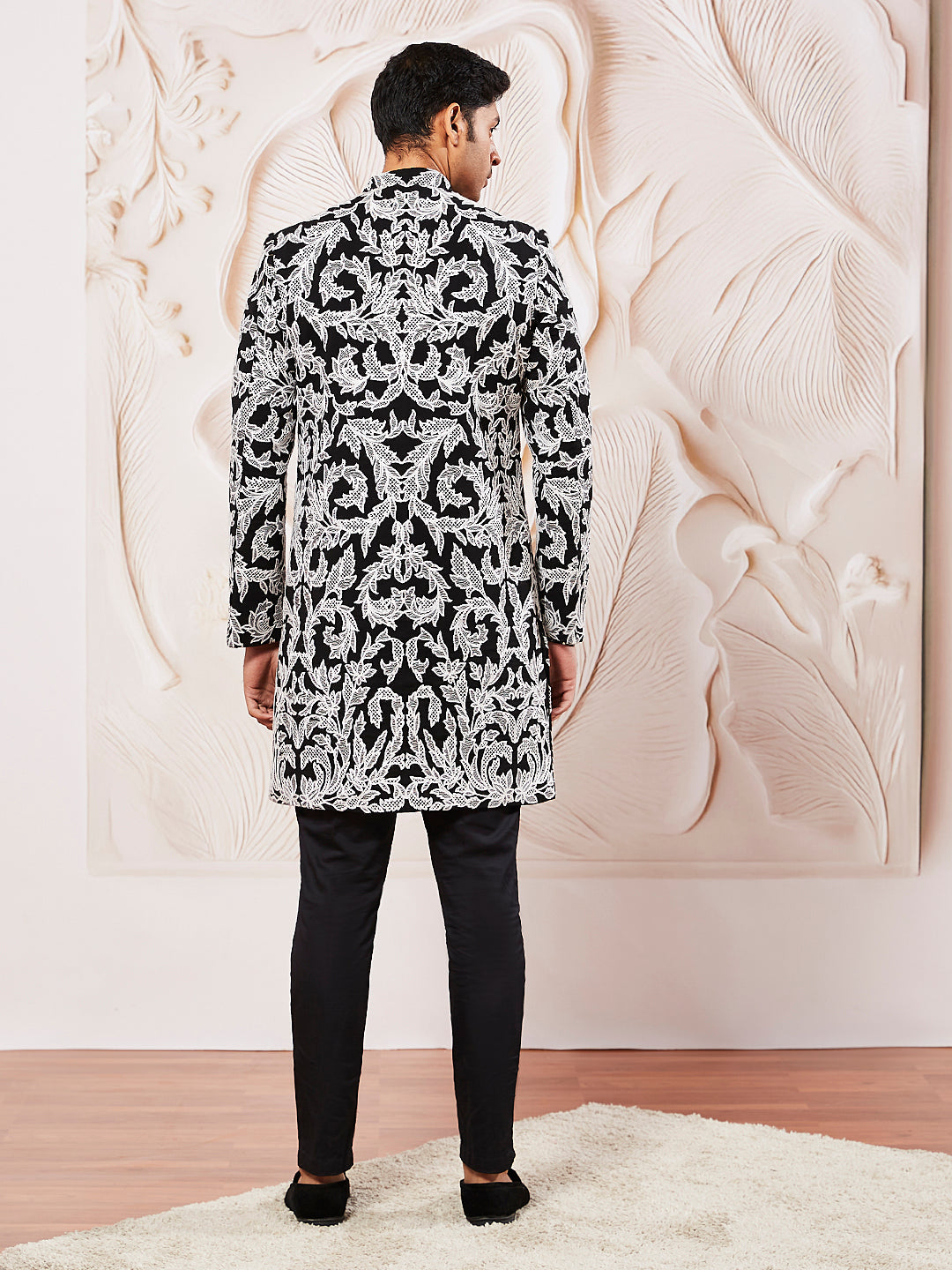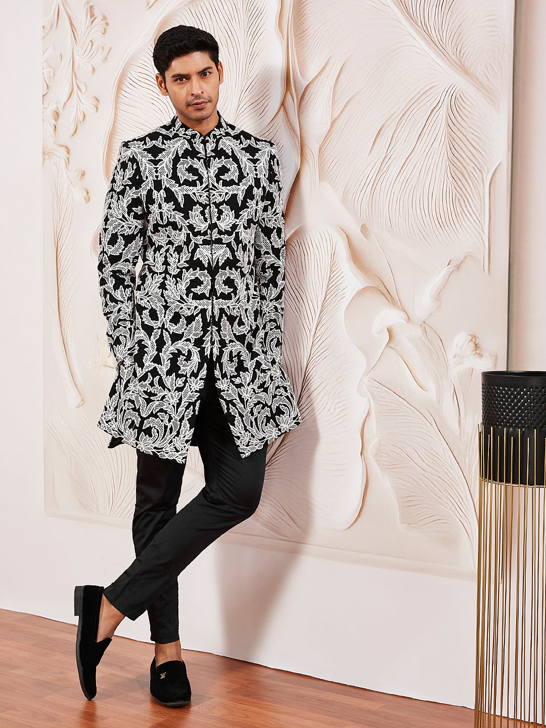 This is an Indo-western and pant set for men. The ensemble includes a coordinated allover sequined embroidered indo western with intricate designs.The pants are tailored, slim-fit, and perfectly complement the indo western. They are simple yet stylish, maintaining the outfit's focus on the upper layers.