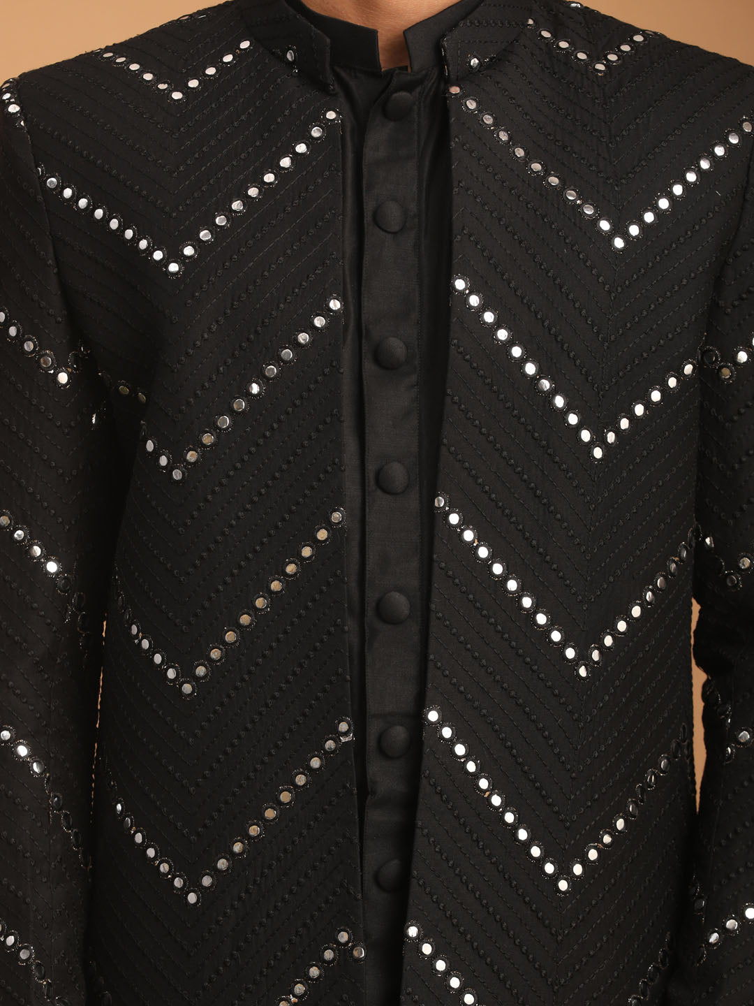 Men's Black Solid Kurta Pant Set With Mirror Over Coat Combo Set